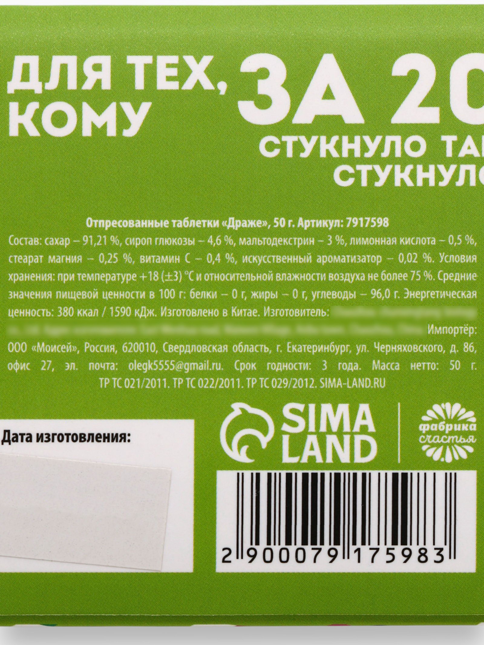 Запрет реализации по сегментам: 00000000266, 00000000534, 00000000593 Размер упаковки: 6.5 x 3.5 x 9 см. Темпер. ограничение НЕ ВЫШЕ ℃: +18 Срок годности, мес: 36 Вид упаковки: Коробка пластиковая Начинка: Без начинки Вкус: Без вкуса Тематика праздника: Универсальная тематика tnved: 1704906200 tnved: 1704906200 Вес нетто, г: 50 Вид: Драже При оформление заказа, просим запрашивать актуальные сроки годности у менеджераСостав: сахар – 91,21 %, сироп глюкозы – 4,6 %, мальтодекстрин – 3 %, лимонная кислота – 0,5 %, стеарат магния – 0,25 %, витамин С – 0,4 %, искусственный ароматизатор – 0,02 %, красители – 0,01 %, E124, E102, E133, E110. Срок годности: 3 года. Масса нетто: 50 г (± 5 г) | ||