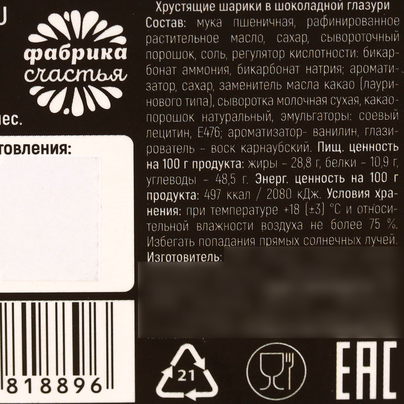 Запрет реализации по сегментам: 00000000266, 00000000593 Размер упаковки: 5.7 x 2.8 x 8.6 см. Размер упаковки: 5.7 x 2.8 x 8.6 см. tnved: 1806903900 Температурное ограничение: Нет Новогодняя коллекция: С Новым годом! Вкус: Без вкуса Вес нетто, г: 75 Начинка: Хрустящий шарик Фасовка: Весовой Вид глазури: Молочный шоколад Вес нетто, кг: 37 Вид: Драже Вид упаковки: Подарочная коробка Тематика праздника: Универсальная тематика ПРИ ОФОРМЛЕНИИ ЗАКАЗА, ПРОСИМ ЗАПРАШИВАТЬ АКТУАЛЬНЫЕ СРОКИ ГОДНОСТИ У МЕНЕДЖЕРА Состав: мука пшеничная, рафинированное растительное масло, сахар, сывороточный порошок, соль, регуляторы кислотности: бикарбонат аммония, бикарбонат натрия; ароматизатор, сахар, заменитель масла какао (лауринового типа), сыворотка молочная сухая, какао-порошок натуральный, эмульгаторы: соевый лецитин, Е476; ароматизатор – ванилин, глазирователь – воск карнаубский. Срок годности: 18 месяцев Масса нетто: 37 гр | ||