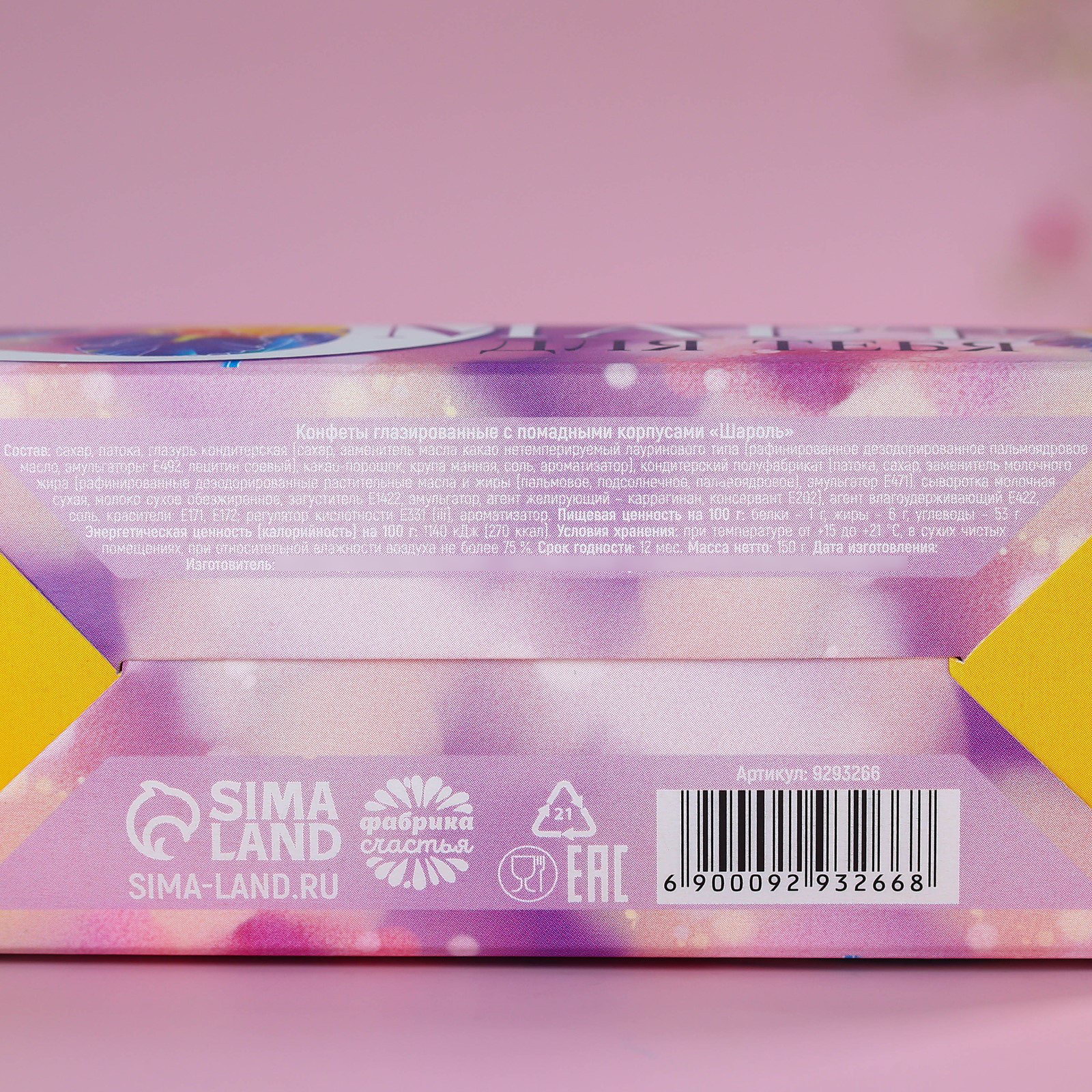 Запрет реализации по сегментам: 00000000266, 00000000593 Размер упаковки: 5 x 12 x 12.3 см. Вид: Шоколадные Вид упаковки: Подарочная коробка Срок годности, мес: 12 Тематика праздника: 8 Марта tnved: 1806310000 Для кого: Для женщины Адресат: Без адресата Набор: Да Температурное ограничение: Нет Вес нетто, г: 150 Вкус: Шоколад При оформление заказа, просим запрашивать актуальные сроки годности у менеджераСостав: сахар, патока, глазурь кондитерская (сахар, заменитель масла какао нетемперируемый лауринового типа (рафинированное дезодорированное пальмоядровое масло, эмульгаторы: Е492, лецитин соевый), какао-порошок, крупа манная, соль, ароматизатор), кондитерский полуфабрикат (патока, сахар, заменитель молочного жира (рафинированные дезодорированные растительные масла и жиры (пальмовое, подсолнечное, пальмоядровое), эмульгатор Е471), сыворотка молочная сухая, молоко сухое обезжиренное, загуститель Е1422, эмульгатор, агент желирующий – каррагинан, консервант Е202), агент влагоудерживающий Е422, соль, красители: Е171, Е172; регулятор кислотности Е331 (iii), ароматизатор. Срок годности: 12 месяцев Масса нетто: 150 гр | ||