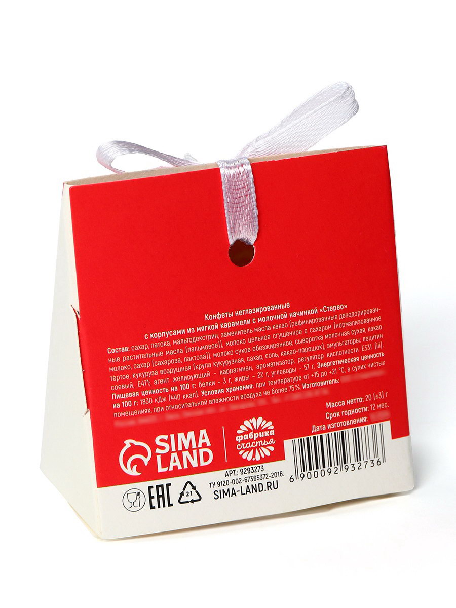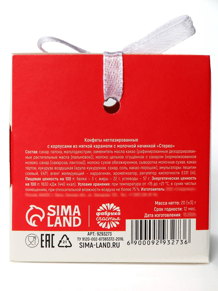 Запрет реализации по сегментам: 00000000266, 00000000593 Размер упаковки: 3.7 x 7.2 x 7.2 см. Вид: Шоколадные Вид упаковки: Подарочная коробка tnved: 1806310000 Температурное ограничение: Нет Вкус: Молоко Тематика праздника: 8 Марта Вес нетто, г: 20 Состав: сахар, патока, мальтодекстрин, заменитель масла какао (рафинированные дезодорированные растительные масла (пальмовое)), молоко цельное сгущённое с сахаром (нормализованное молоко, сахар (сахароза, лактоза)), молоко сухое обезжиренное, сыворотка молочная сухая, какао тёртое, кукуруза воздушная (крупа кукурузная, сахар, соль, какао-порошок), эмульгаторы: лецитин соевый, Е471; агент желирующий – каррагинан, ароматизатор, регулятор кислотности Е331 (iii). Срок годности: 12 мес. Масса нетто: 20 (±3) г | ||
