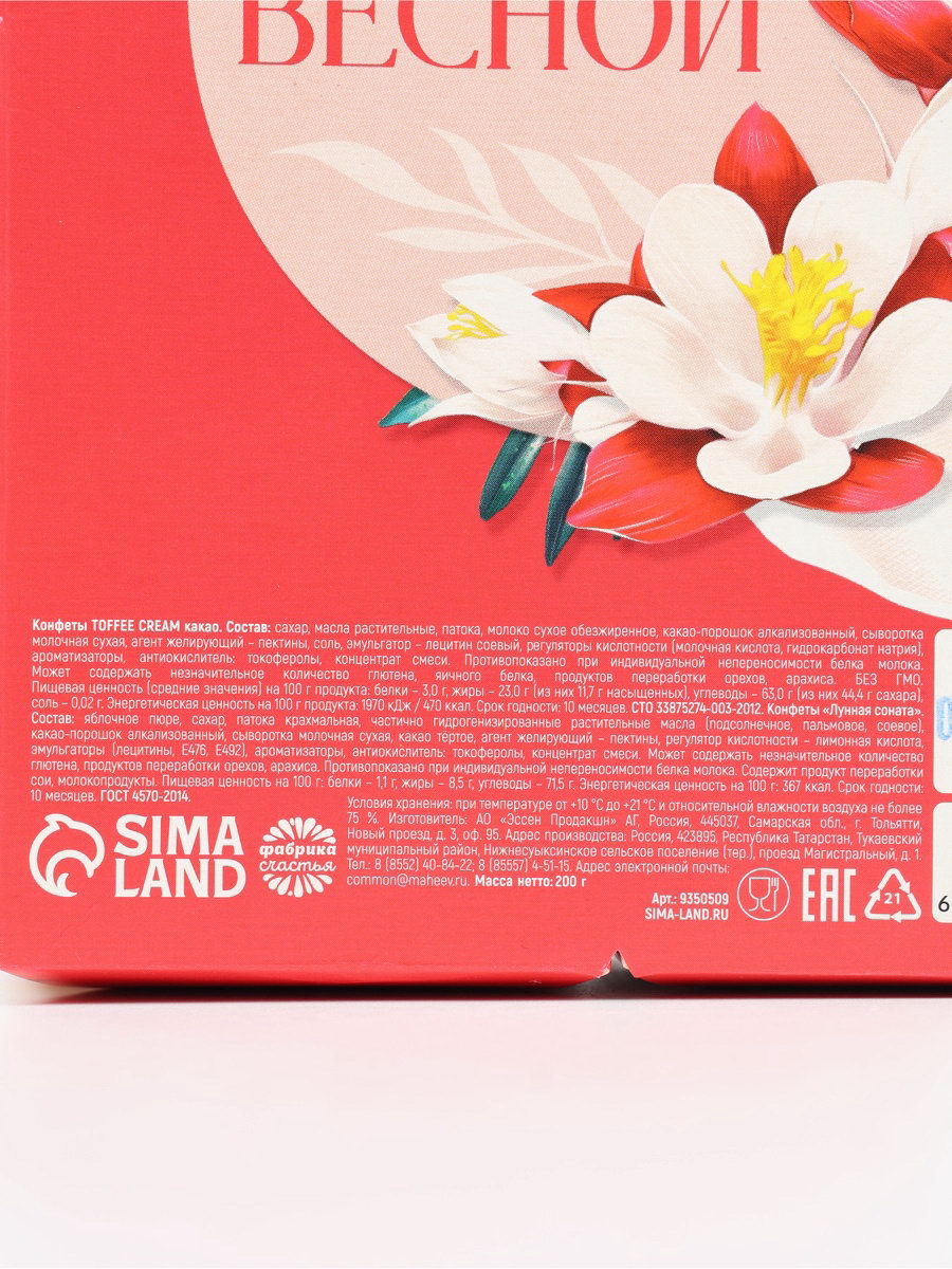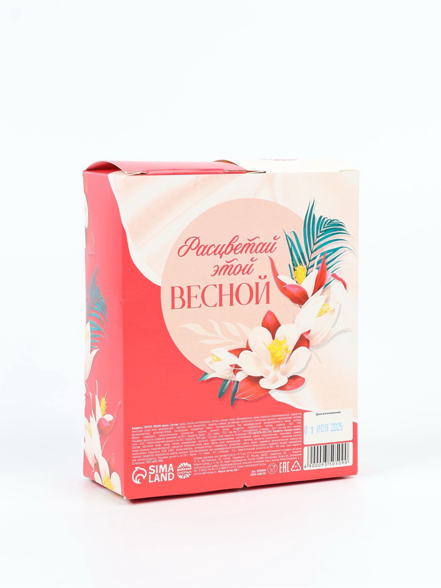 Запрет реализации по сегментам: 00000000266, 00000000593 Срок годности, мес: 10, 12 Размер упаковки: 5.7 x 17 x 11.2 см. Вид упаковки: Подарочная коробка Вид: Шоколадные Тематика праздника: 8 Марта tnved: 1806201000 Температурное ограничение: Нет Вкус: Какао Вес нетто, г: 200 При оформление заказа, просим запрашивать актуальные сроки годности у менеджераКонфеты TOFFEE CREAM, какао Состав: сахар, масла растительные, патока, молоко сухое обезжиренное, какао-порошок алкализованный, сыворотка молочная сухая, агент желирующий – пектины, соль, эмульгатор – лецитин соевый, регуляторы кислотности (молочная кислота, гидрокарбонат натрия), ароматизаторы, антиокислитель – токоферолы, концентрат смеси. Противопоказано при индивидуальной непереносимости белка молока. Может содержать незначительное количество глютена, яичного белка, продуктов переработки орехов, арахиса. БЕЗ ГМО. Срок годности: 10 месяцев. Конфеты BON BONEL Состав: сахар, масла растительные, патока, какао-порошок алкализованный, молоко сухое обезжиренное, арахис обжаренный тёртый, сыворотка молочная сухая, соль, эмульгаторы (лецитин соевый, Е 476), ферментный препарат микробного происхождения – инвертаза, ароматизаторы, антиокислитель – токоферолы, концентрат смеси. Может содержать незначительное количество глютена, яичного белка, продуктов переработки ор | ||