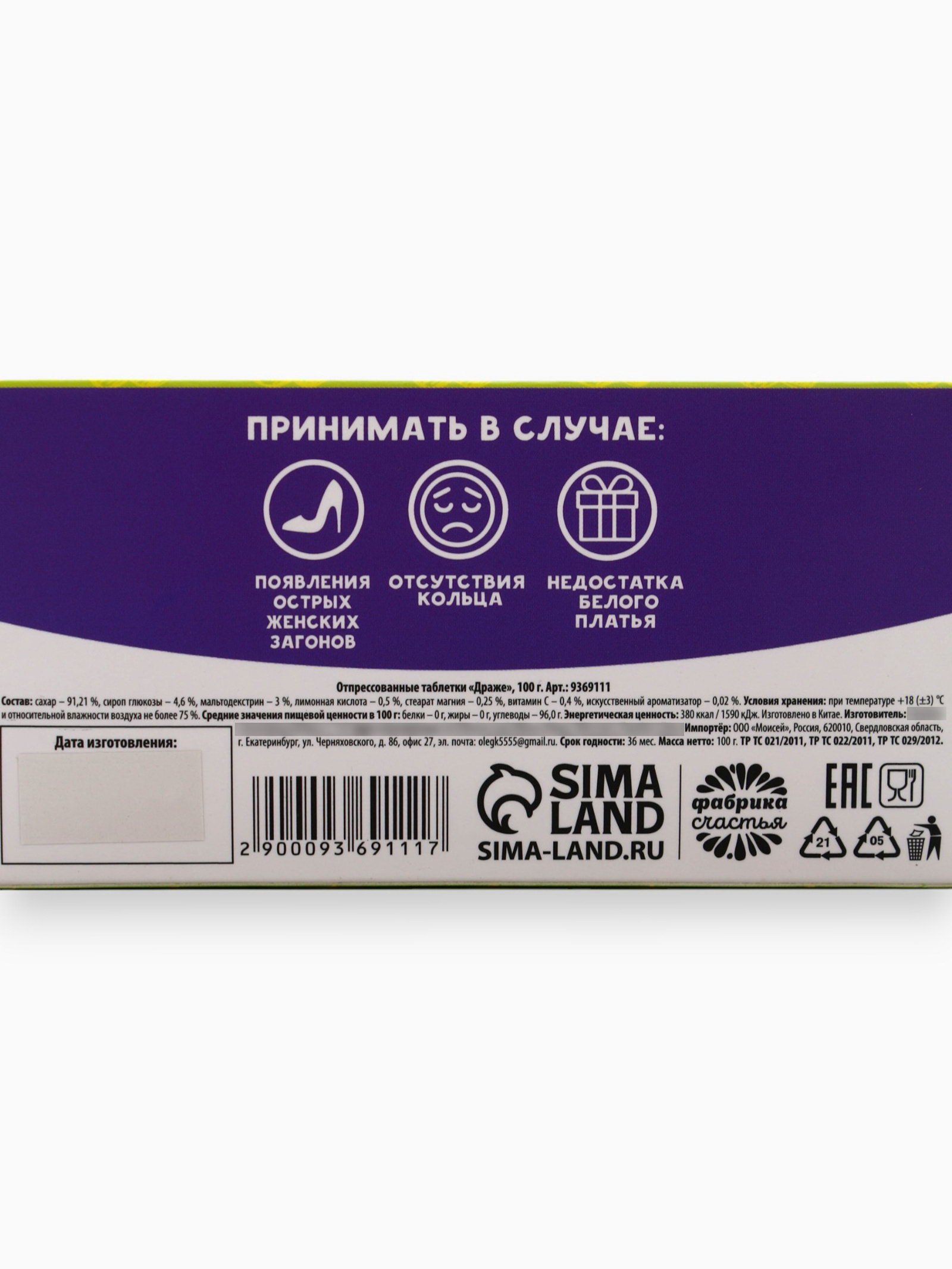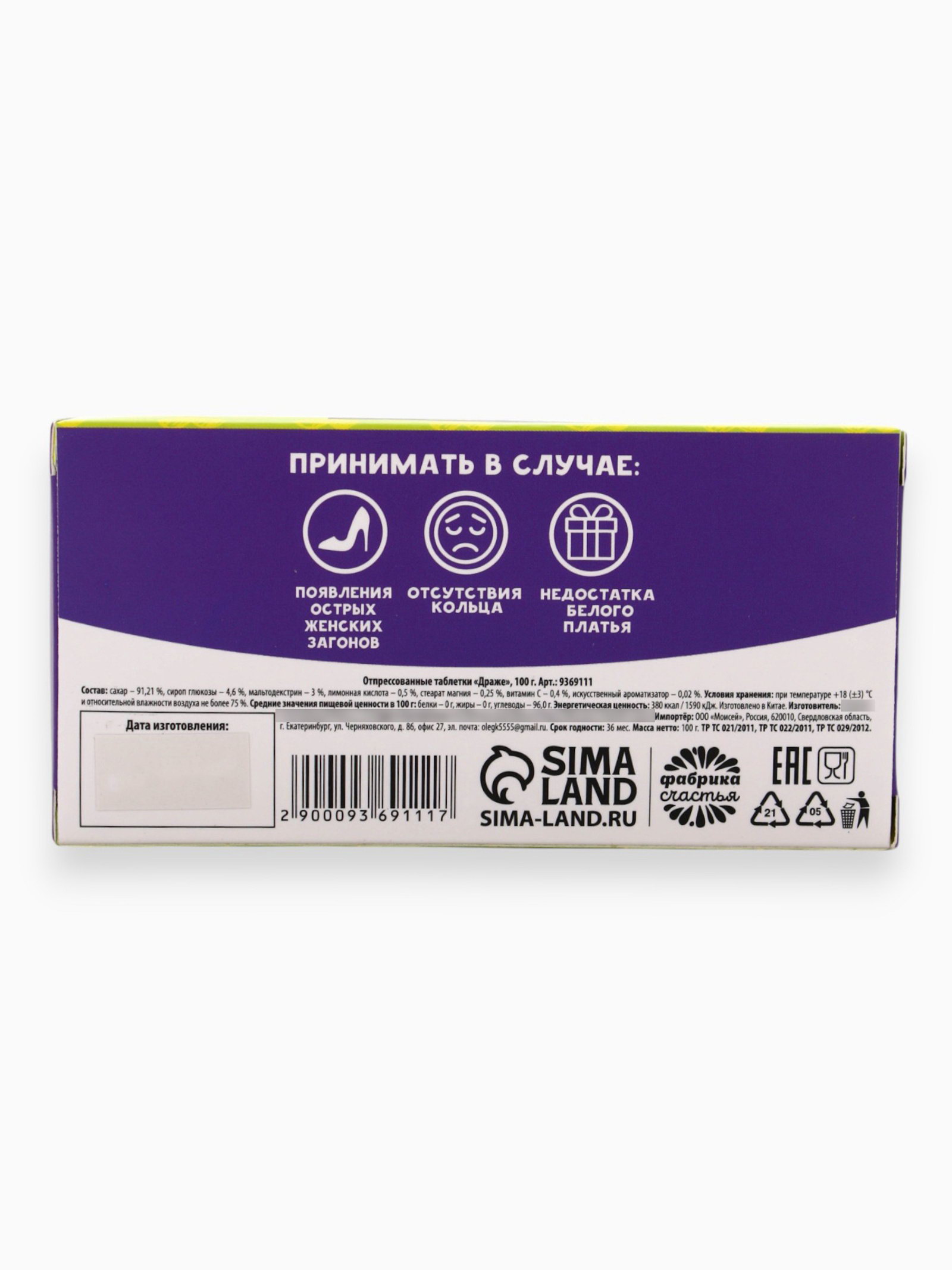 Запрет реализации по сегментам: 00000000266, 00000000593 Размер упаковки: 5.6 x 3.2 x 11.1 см. Темпер. ограничение НЕ ВЫШЕ ℃: +18 Срок годности, мес: 36 Вид упаковки: Коробка картонная Начинка: Без начинки Вкус: Без вкуса Тематика праздника: Универсальная тематика tnved: 1704908200 tnved: 1704908200 Температурное ограничение: Нет Вес нетто, г: 100 Вид: Драже ПРИ ОФОРМЛЕНИИ ЗАКАЗА, ПРОСИМ ЗАПРАШИВАТЬ АКТУАЛЬНЫЕ СРОКИ ГОДНОСТИ У МЕНЕДЖЕРА Состав: сахар – 91,21 %, сироп глюкозы – 4,6 %, мальтодекстрин – 3 %, лимонная кислота – 0,5 %, стеарат магния – 0,25 %, витамин С – 0,4 %, искусственный ароматизатор – 0,02 %, красители – 0,01 %, Е124, Е102, Е133, Е110. Срок годности: 36 месяцев. Масса нетто: 100 гр | ||
