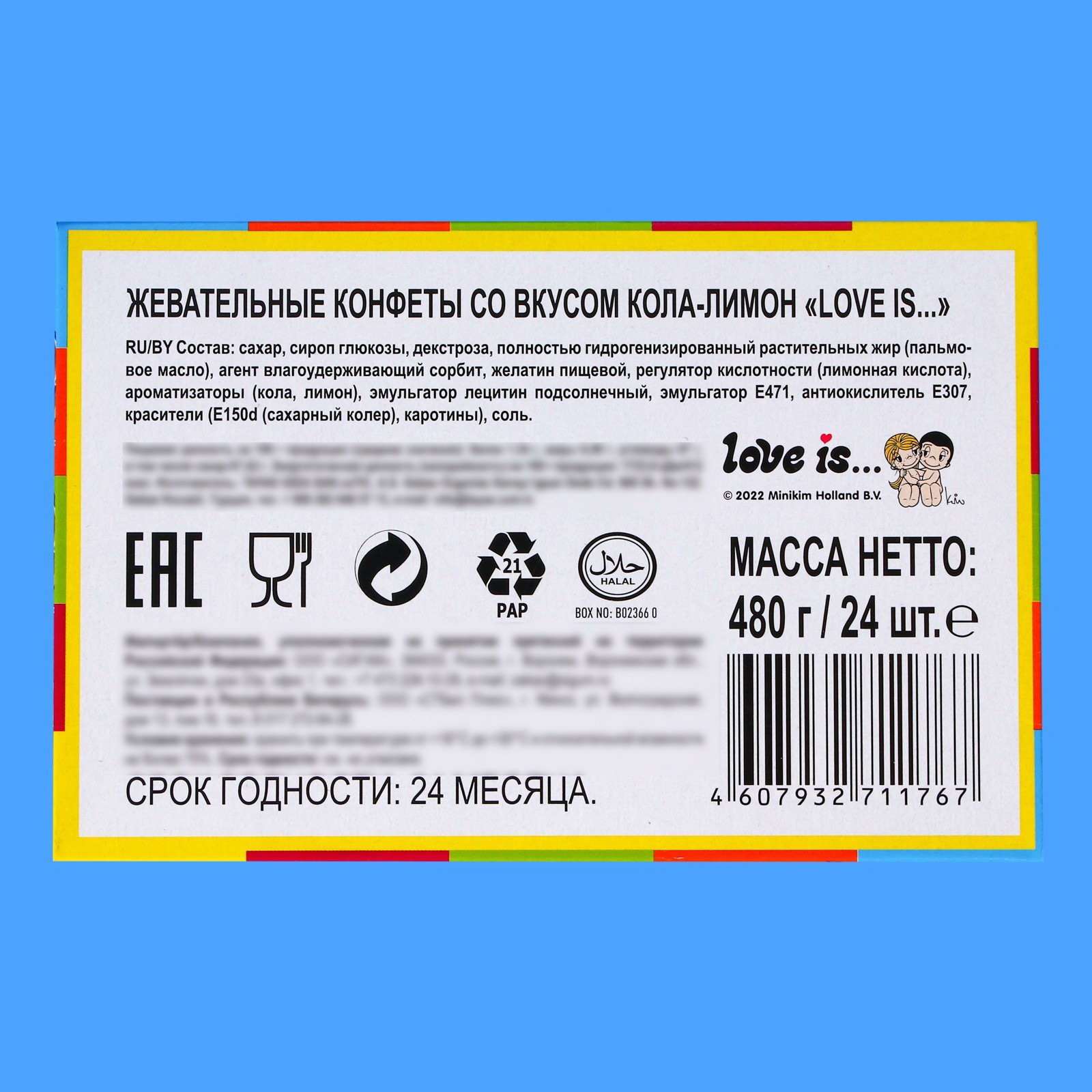 Вкус: Кола, Лимон Тематика праздника: 14 Февраля, Универсальная тематика Размер упаковки: 2.5 x 1 x 9 см. Форма: Подушечка tnved: 1704101000 tnved: 1704101000 Продукты: Да Температурное ограничение: Нет Вес нетто, г: 20 Вид: Жевательные Вид упаковки: Бумажная обертка Жевательные конфеты с любимыми персонажами - новый формат всем знакомого вкуса. Это отличный мини-подарок своей второй половинке, ведь яркие вкладыши с надписями и рисунками способны растопить сердце и порадовать каждого. Яркий и сочный вкус колы и лимона мгновенно взбодрит вкусом и порадует сладостью. Состав: сахар, сироп глюкозы, декстроза, полностью гидрогенизированный растительный жир (пальмовое масло), агент влагоудерживающий сорбит, желатин пищевой, регулятор кислотности (лимонная кислота), ароматизаторы (кола, лимон), эмульгатор лецитин подсолнечный, эмульгатор Е471, антиокислитель Е307, красители (Е150d (сахарный колер), каротины), соль. | ||