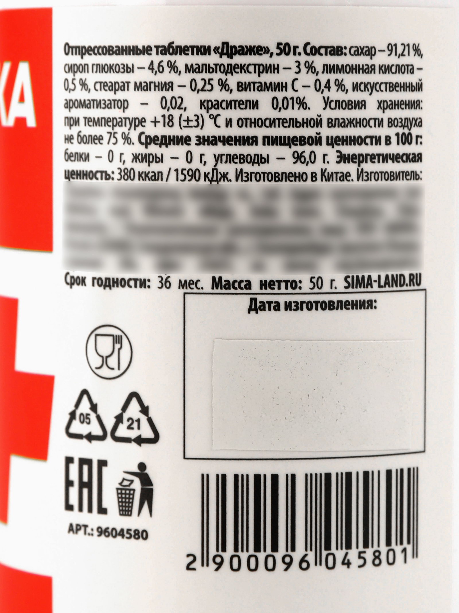 Запрет реализации по сегментам: 00000000266, 00000000593 Размер упаковки: 5 x 9.5 x 5 см. tnved: 1704908200 Вес нетто, г: 50 Вид: Драже Вкус: Ассорти Вид упаковки: Пластиковая банка Тематика праздника: Универсальная тематика ПРИ ОФОРМЛЕНИИ ЗАКАЗА, ПРОСИМ ЗАПРАШИВАТЬ АКТУАЛЬНЫЕ СРОКИ ГОДНОСТИ У МЕНЕДЖЕРА Состав: сахар 91,21 %, сироп глюкозы 4,6 %, мальтодекстрин 3 %, лимонная кислота 0,5 %, стеарат магния 0,25 %, витамин С 0,4 %, искусственный ароматизатор 0,02%, красители 0,01 %, Е129, Е102, Е133, Е110. Срок годности: 36 месяцев Масса нетто: 50 гр | ||