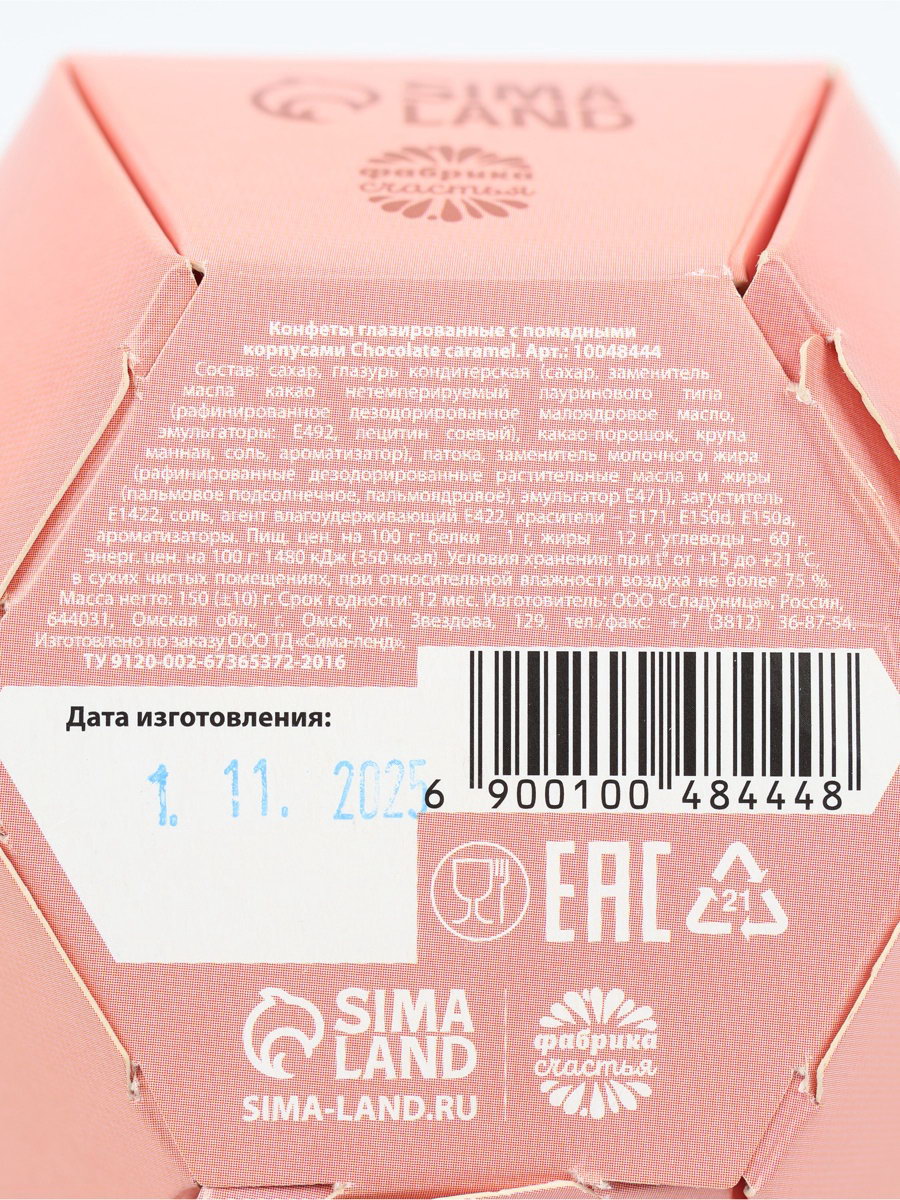 Запрет реализации по сегментам: 00000000266, 00000000593 Размер упаковки: 11.5 x 11 x 9.5 см. Вид упаковки: Подарочная коробка Вкус: Карамель Вид: Шоколадные Вес нетто, г: 150 Тематика праздника: Универсальная тематика tnved: 1806209500 ПРИ ОФОРМЛЕНИИ ЗАКАЗА, ПРОСИМ ЗАПРАШИВАТЬ АКТУАЛЬНЫЕ СРОКИ ГОДНОСТИ У МЕНЕДЖЕРА Состав: сахар, глазурь кондитерская (сахар, заменитель масла какао нетемперируемый лауринового типа (рафинированное дезодорированное пальмоядровое масло, эмульгаторы: Е492, леуитин соевый), какао-порошок, крупа манная, соль, ароматизатор) патока, заменитель молочного жира (рафинированные дезодорированные растительные масла и жиры (пальмовое, подсолнечное, пальмоядровое), эмульгатор Е471), загуститель Е1422, соль, агент влагоудерживающий Е422, красители: Е171, Е150d, Е150а; ароматизаторы. Срок годности: 12 месяцев Масса нетто: 150 (±10) гр | ||