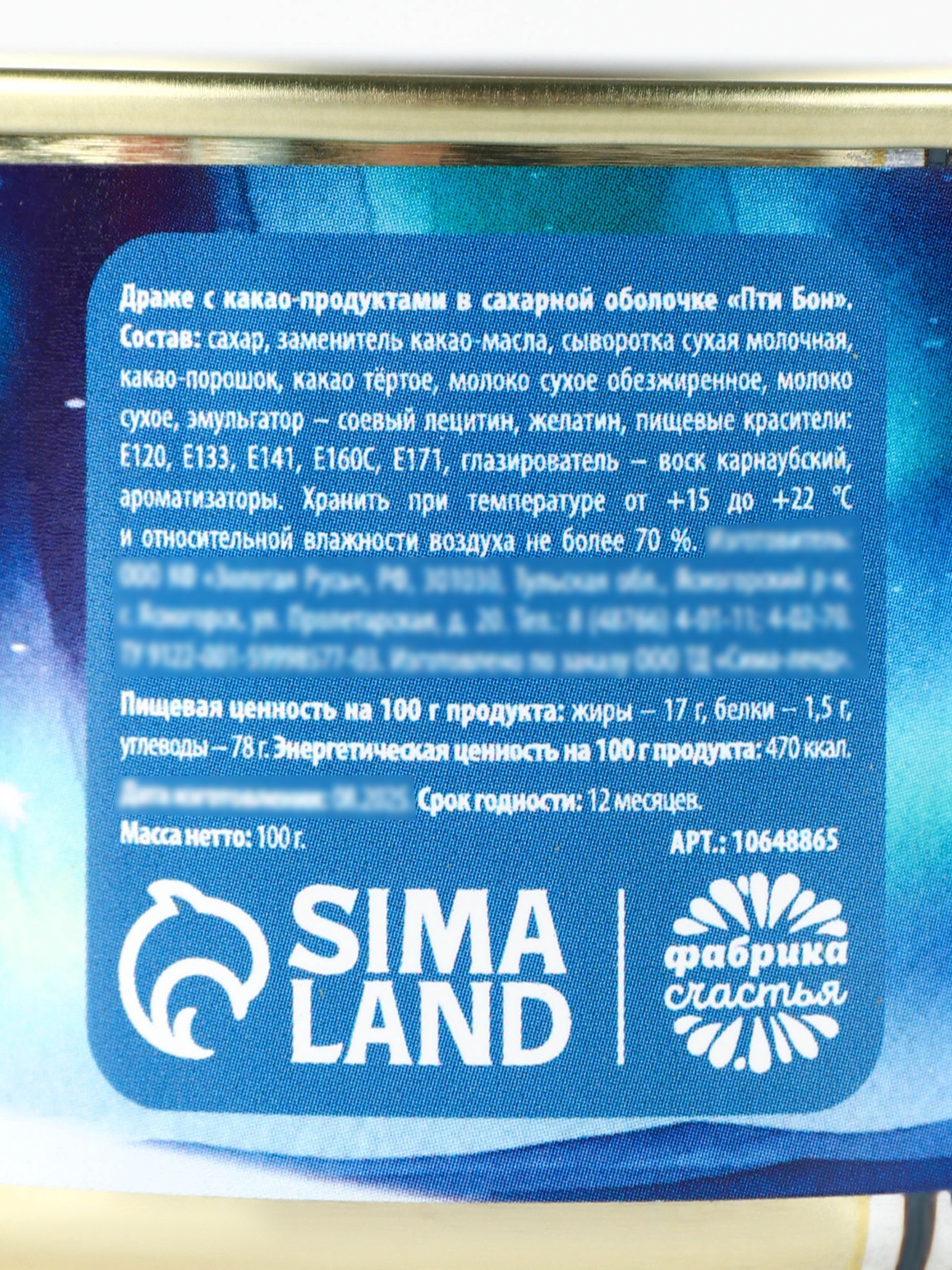 Запрет реализации по сегментам: 00000000266, 00000000593 Размер упаковки: 8.6 x 5.6 x 8.6 см. Вкус: Шоколад Вид: Драже Вес нетто, г: 100 Тематика праздника: Новый год Вид упаковки: Банка металлическая tnved: 1704906200 tnved: 1704906200 Символ года: Нет Новогодняя коллекция: Новый год ПРИ ОФОРМЛЕНИИ ЗАКАЗА, ПРОСИМ ЗАПРАШИВАТЬ АКТУАЛЬНЫЕ СРОКИ ГОДНОСТИ У МЕНЕДЖЕРА Состав: сахар, заменитель какао-масла, сыворотка сухая молочная, какао-порошок, какао тёртое, молоко сухое обезжиренное, молоко сухое, эмульгатор – соевый лецитин, желатин, пищевые красители: Е120, Е133, Е141, Е160С, Е171, глазирователь – воск карнаубский, ароматизаторы. Масса нетто: 100 гр Срок годности: 12 месяцев. | ||