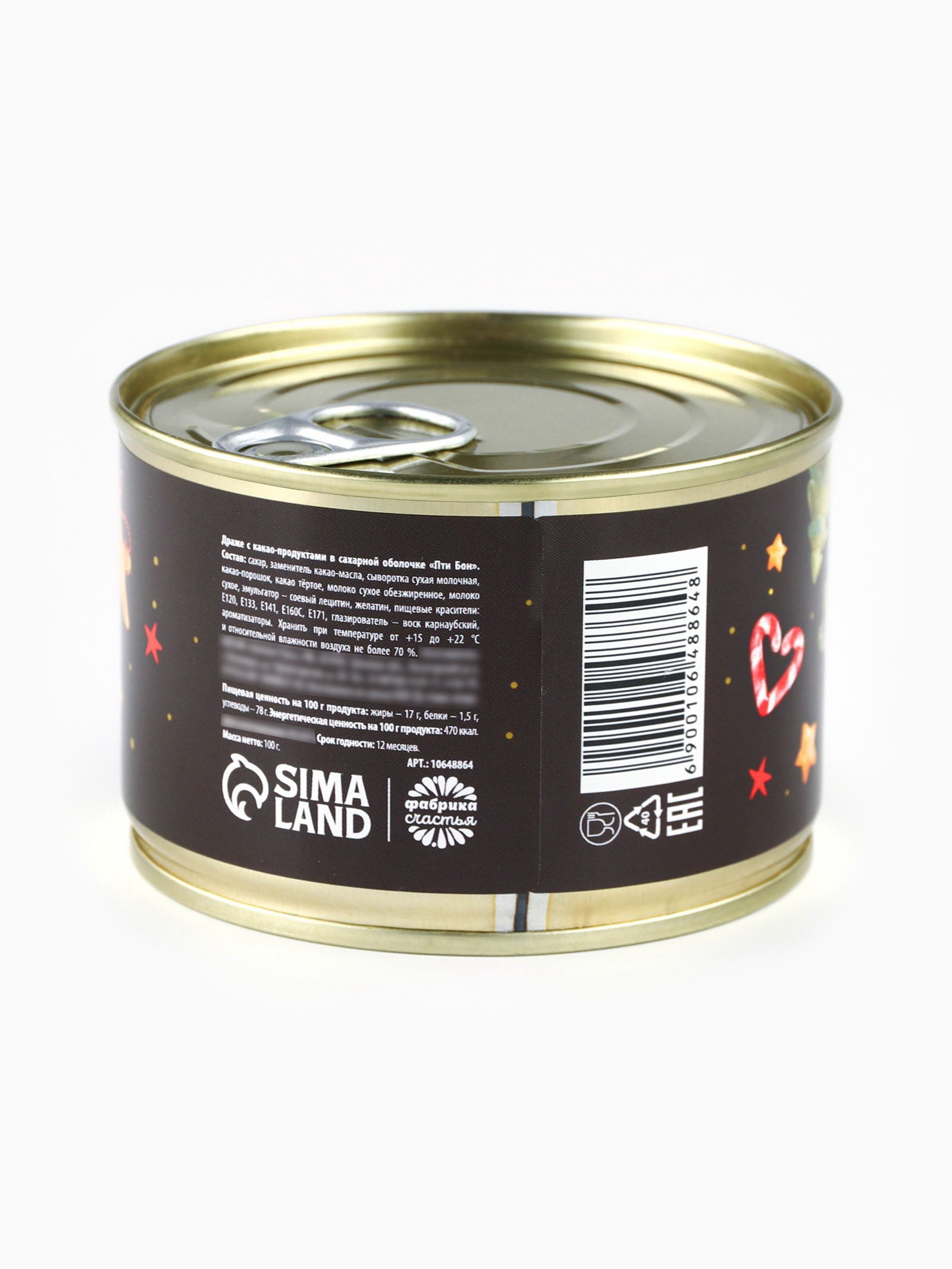 Запрет реализации по сегментам: 00000000266, 00000000593 Размер упаковки: 8.6 x 5.6 x 8.6 см. Вес нетто, г: 100 Тематика праздника: Новый год Вид упаковки: Банка Вид: Драже tnved: 1704906200 tnved: 1704906200 Вкус: Шоколад Символ года: Нет Новогодняя коллекция: Новый год ПРИ ОФОРМЛЕНИИ ЗАКАЗА, ПРОСИМ ЗАПРАШИВАТЬ АКТУАЛЬНЫЕ СРОКИ ГОДНОСТИ У МЕНЕДЖЕРА Состав: сахар, заменитель какао-масла, сыворотка сухая молочная, какао-порошок, какао тёртое, молоко сухое обезжиренное, молоко сухое, эмульгатор – соевый лецитин, желатин, пищевые красители: Е120, Е133, Е141, Е160С, Е171, глазирователь – воск карнаубский, ароматизаторы. Масса нетто: 100 гр Срок годности: 12 месяцев. | ||