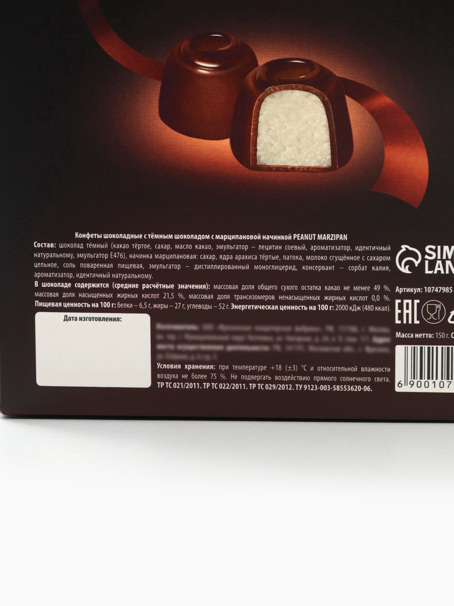 Запрет реализации по сегментам: 00000000266, 00000000593 Размер упаковки: 12 x 18.5 x 6 см. Вес нетто, г: 150 Вид упаковки: Подарочная коробка Вид: Шоколадные Вкус: Марципан Тематика праздника: Универсальная тематика tnved: 1806209500 ПРИ ОФОРМЛЕНИИ ЗАКАЗА, ПРОСИМ ЗАПРАШИВАТЬ АКТУАЛЬНЫЕ СРОКИ ГОДНОСТИ У МЕНЕДЖЕРА Состав: шоколад тёмный (какао тёртое, сахар, масло какао, эмульгатор – лецитин соевый, ароматизатор, идентичный натуральному, эмульгатор Е476), начинка марципановая: сахар, ядра арахиса тёртые, патока, молоко сгущённое с сахаром цельное, соль поваренная пищевая, эмульгатор – дистиллированный моноглицерид, консервант – сорбат калия, ароматизатор, идентичный натуральному. В шоколаде содержится (средние расчётные значения):