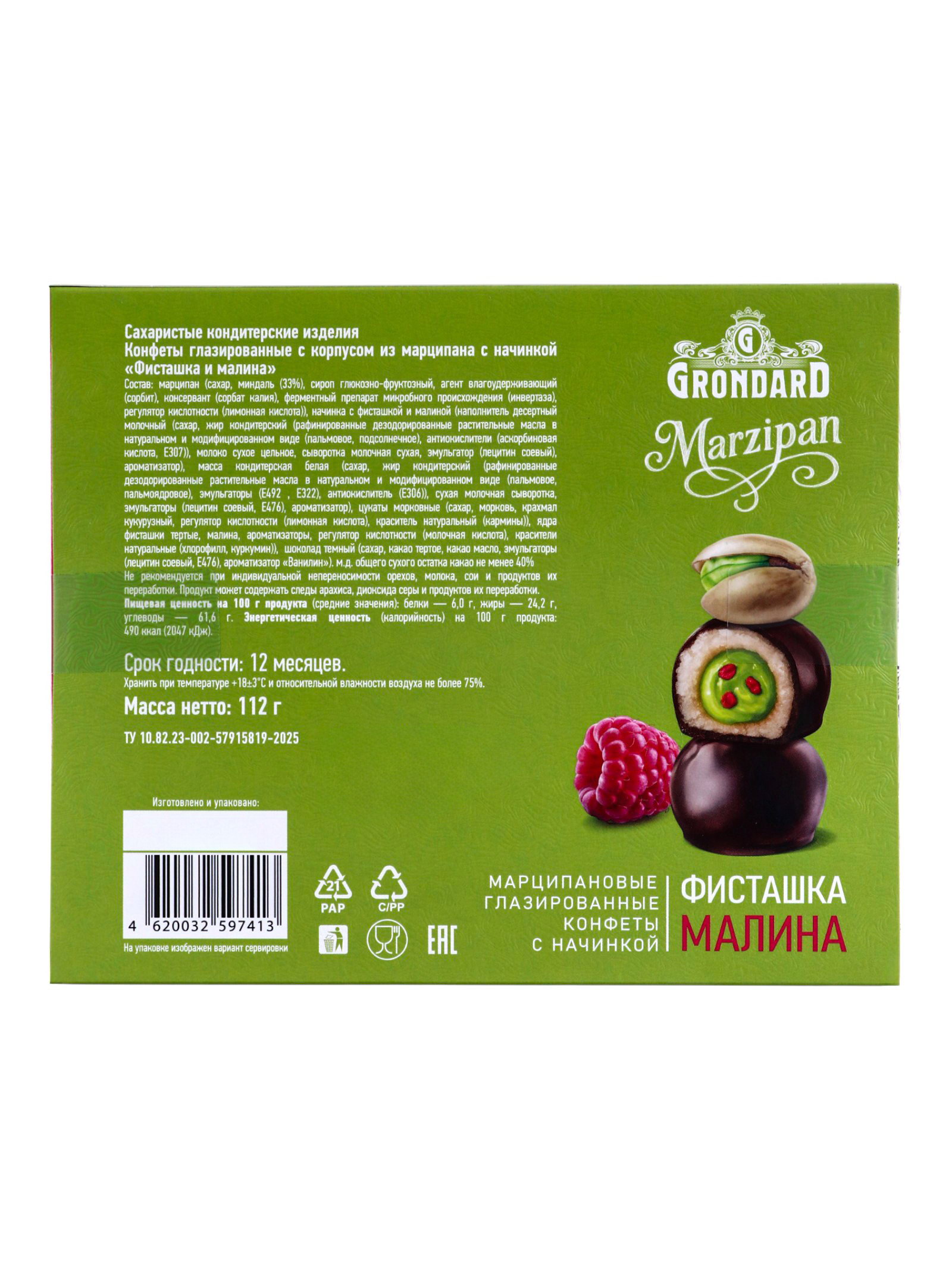 Конфеты глазированные "Фисташка и малина", с корпусом из марципана, с начинкой, 112 г, Россия