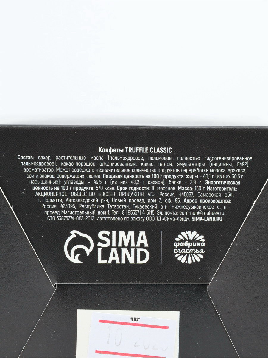 Запрет реализации по сегментам: 00000000266, 00000000593 Размер упаковки: 8 x 8 x 8 см. tnved: 1806209500 Вес нетто, г: 150 Вид: Шоколадные Вид упаковки: Подарочная коробка Срок годности, мес: 10 Вкус: Шоколад Тематика праздника: Универсальная тематика Возраст: Для взрослых Адресат: Без адресата Конфеты TRUFFLE CLASSIC Состав: сахар, растительные масла (пальмоядровое, пальмовое; полностью гидрогенизированное пальмоядровое), какао-порошок алкализованный, какао тертое, эмульгаторы (лецитины, E492), ароматизатор. Может содержать незначительное количество продуктов переработки молока, арахиса, сои и злаков, содержащих глютен. Пищевая ценность на 100 г продукта: жиры - 40,1 г (из них 30,5 г насыщенных); углеводы -- 49,5 г (из них 48 их 48,2 г сахара); белки - 2,9 гр Энергетическая ценность на 100 г продукта: 570 ккал. Срок годности: 10 месяцев. Масса: 150 г | ||