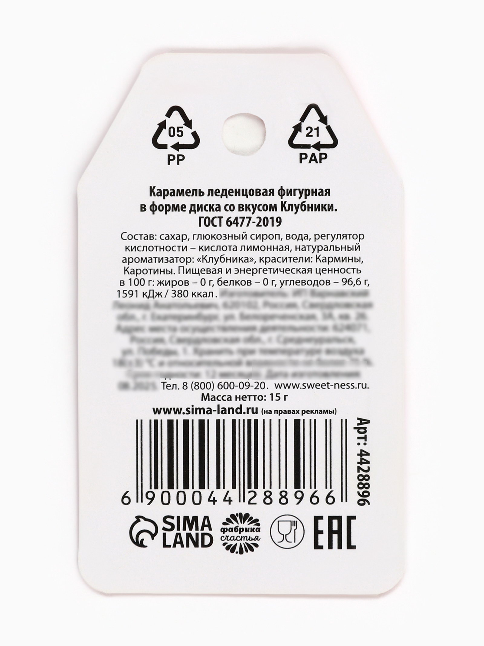 Запрет реализации по сегментам: 00000000266, 00000000593 Размер упаковки: 4 x 0.8 x 16.5 см. tnved: 1704907100 Новогодняя коллекция: Новый год Набор: Нет Температурное ограничение: Нет Вкус: Клубника На палочке: Да Вес нетто, г: 15 Тематика праздника: Новый год Символ года: Нет ПРИ ОФОРМЛЕНИИ ЗАКАЗА, ПРОСИМ ЗАПРАШИВАТЬ АКТУАЛЬНЫЕ СРОКИ ГОДНОСТИ У МЕНЕДЖЕРА Состав: сахар, патока, вода, регулятор кислотности - лимонная кислота, натуральные красители: Кармины, бета-апо-8-Каротиновый альдегид и натуральный ароматизатор: "Клубника". Масса нетто: 15 гр Срок годности: 12 месяцев. | ||
