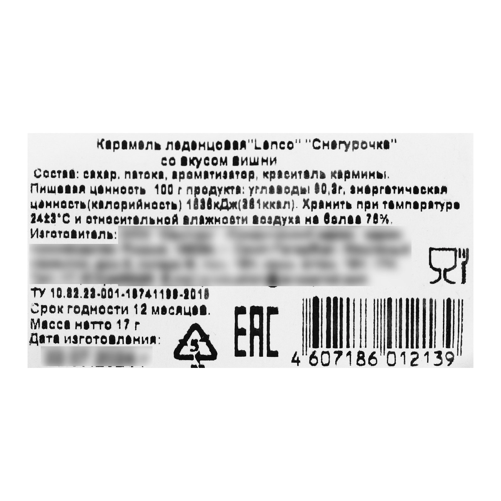 Тематика праздника: Новый год, Рождество Новогодняя коллекция: Новый год, Рождество Размер упаковки: 1 x 13 x 5.5 см. Символ года: Нет Тематика: Новогодняя tnved: 1704907100 Продукты: Да Температурное ограничение: Нет Темпер. ограничение НЕ ВЫШЕ ℃: +18 Вес нетто, г: 17 На палочке: Да Вкус: Бабл-гам Состав: изомальт, подсластитель (сукралоза), регулятор кислотности (лимонная кислота), ароматизаторы, красители (хлорофил, куркумин, аннато). Энергетическая ценность (калорийность) на 100 г продукта: углеводы – 96,8 г, 973 кДж (233 ккал). Срок годности: 24 месяца. | ||