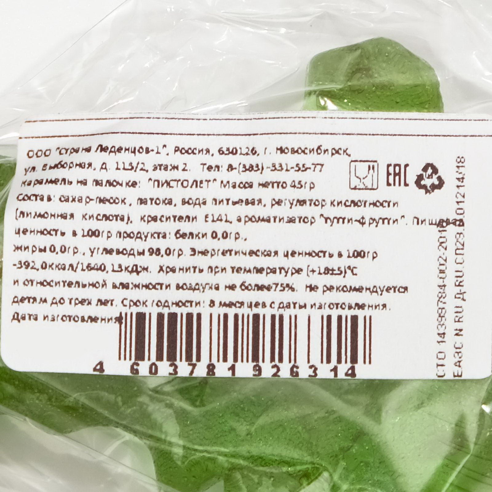 Карамель на палочке "Пистолет" зеленый, 45 г, Страна леденцов, Россия