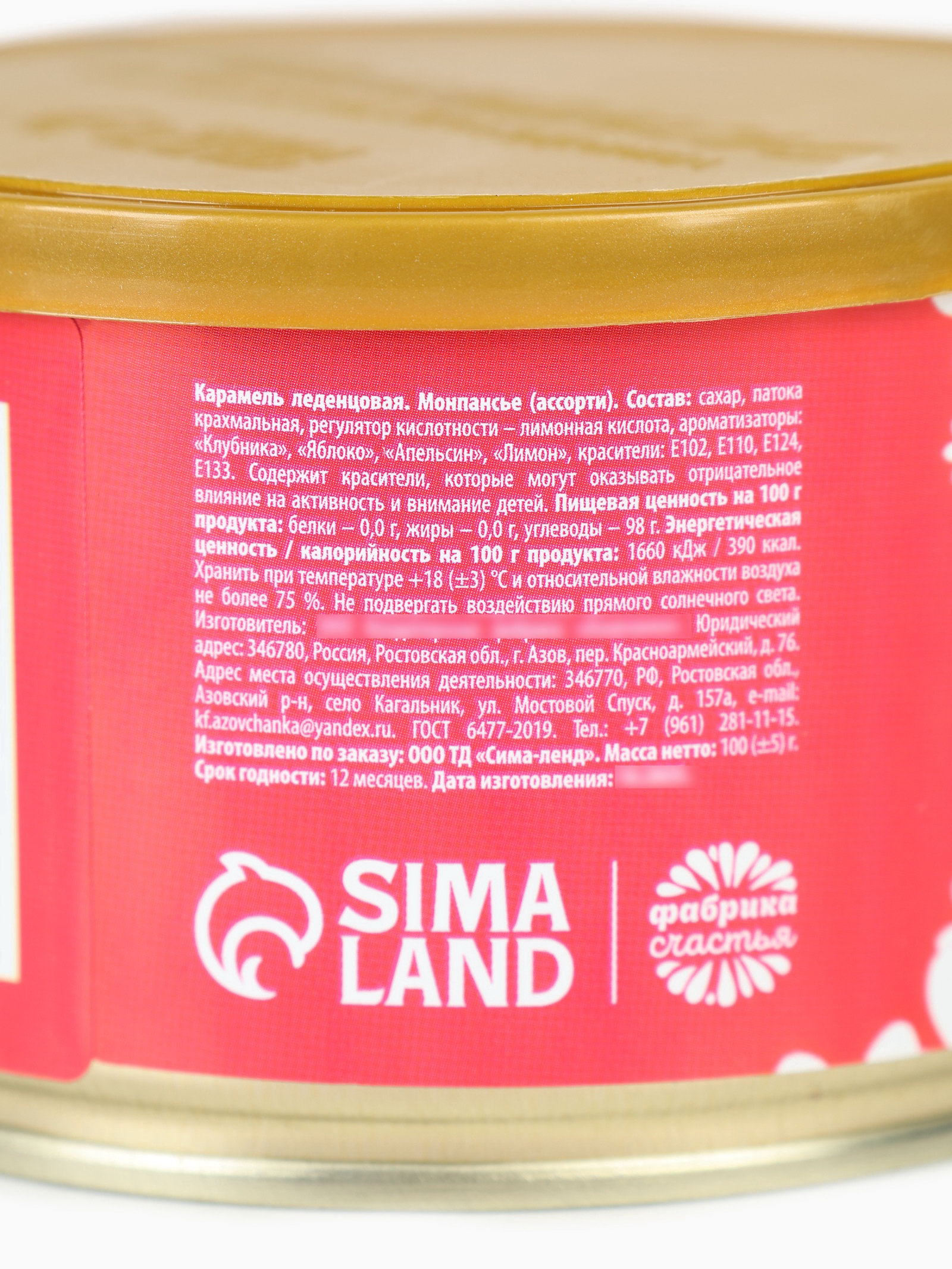 Запрет реализации по сегментам: 00000000266, 00000000593 Вкус: Абрикос, Лимон, Малина, Чёрная смородина, Яблоко Размер упаковки: 8.7 x 5.3 x 8.7 см. tnved: 1704907100 Для кого: Для женщины Набор: Нет Температурное ограничение: Нет Тематика праздника: 8 Марта Вес нетто, г: 140 На палочке: Нет При оформление заказа, просим запрашивать актуальные сроки годности у менеджераМонпансье это идеальный сладкий презент или вкусное дополнение к основному подарку! Леденцы в банке это маленькие сосательные конфетки с кисло-сладким фруктовым вкусом разных форм и размеров. 1 баночка содержит 140 грамм конфет Состав: сахар белый кристаллический, патока крахмальная, регулятор кислотности - лимонная кислота (Е330), ароматизаторы: "Смородина", "Малина", "Абрикос", "Лимон", "Яблоко", красители (Е102, Е110, Е129). Срок годности: 12 месяцев | ||