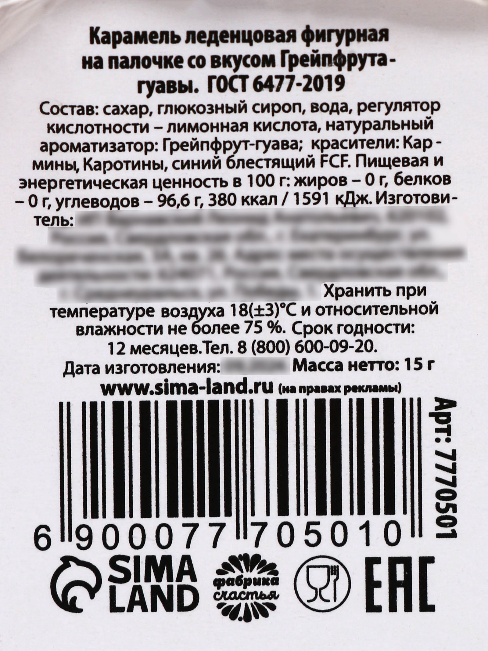 Запрет реализации по сегментам: 00000000266, 00000000593 Вкус: Грейпфрут, Гуава Размер упаковки: 4.5 x 0.5 x 16 см. Темпер. ограничение НЕ ВЫШЕ ℃: +25 Темпер. ограничение НЕ НИЖЕ ℃: +5 Темпер. ограничение НЕ НИЖЕ ℃: +5 tnved: 1704907100 Символ года: Нет Новогодняя коллекция: Новый год Набор: Нет Температурное ограничение: Нет Тематика праздника: Новый год Вес нетто, г: 15 На палочке: Да При оформление заказа, просим запрашивать актуальные сроки годности у менеджераСостав: сахар, глюкозный сироп, вода, регулятор кислотности - лимонная кислота, натуральный ароматизатор: Грейпфрут-гуава; красители: бета-апо-8-Каротиновый альдегид, Каротины, синий блестящий FCF. Масса нетто: 15 гр Срок годности: 12 месяцев. | ||