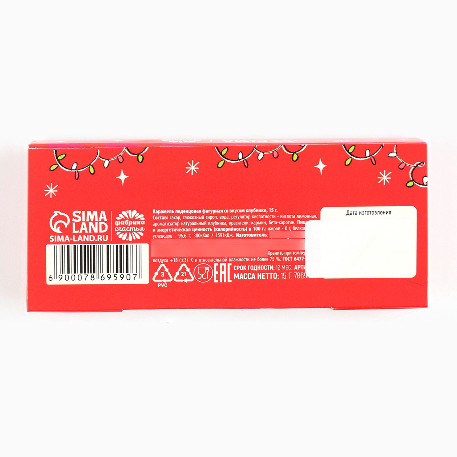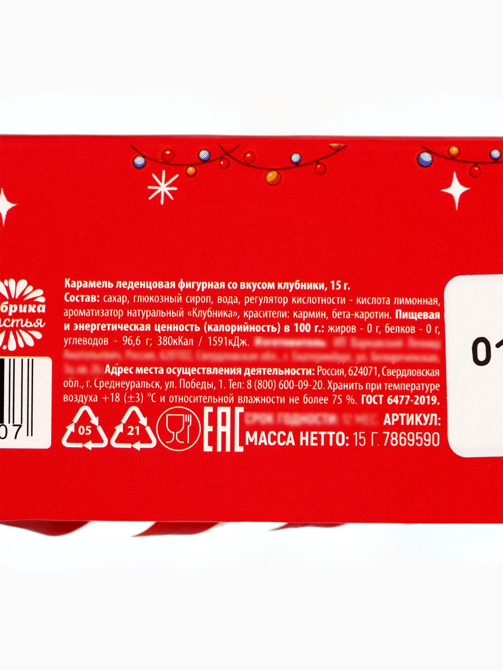 Запрет реализации по сегментам: 00000000266, 00000000593 Размер упаковки: 4 x 1.5 x 10 см. tnved: 1704907100 Набор: Нет Новогодняя коллекция: Новый год Символ года: Символ года 2026 (Лошадь) Температурное ограничение: Нет Тематика праздника: Новый год На палочке: Нет Вес нетто, г: 15 Вкус: Клубника ПРИ ОФОРМЛЕНИИ ЗАКАЗА, ПРОСИМ ЗАПРАШИВАТЬ АКТУАЛЬНЫЕ СРОКИ ГОДНОСТИ У МЕНЕДЖЕРА Состав: сахар, патока, регуляторы кислотности: лимонная кислота, яблочная кислота; ароматизатор, краситель -кармин. Срок годности: 24 месяца Масса нетто: 15 гр | ||