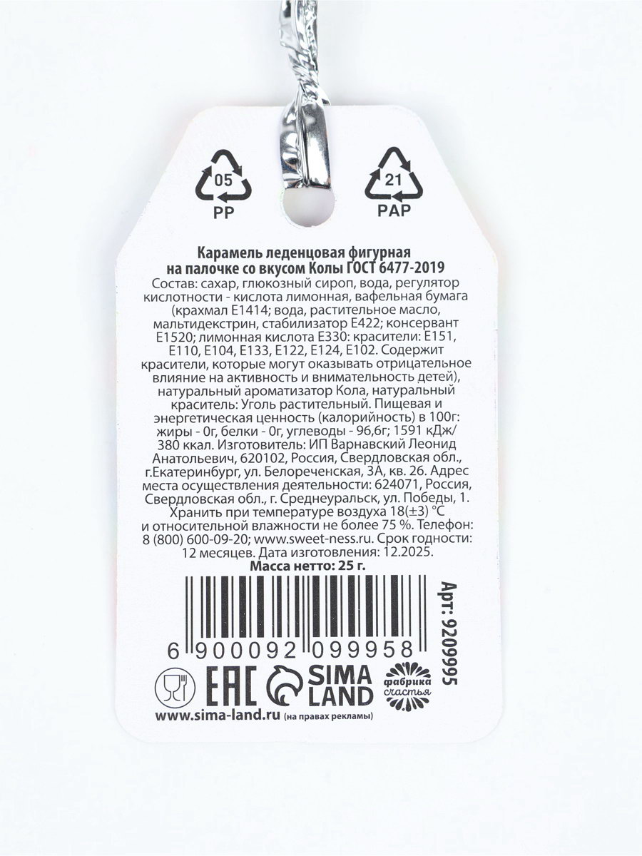 Запрет реализации по сегментам: 00000000266, 00000000593 Размер упаковки: 0.8 x 17.5 x 5 см. Тематика праздника: Универсальная тематика tnved: 1704905500 Температурное ограничение: Нет Вес нетто, г: 25 На палочке: Да Вкус: Кола При оформление заказа, просим запрашивать актуальные сроки годности у менеджераСостав: вода, сахар, патока, лимонная кислота, ароматизатор – кола, краситель – михром чёрный. Срок годности: 24 мес. Масса нетто: 25 гр | ||
