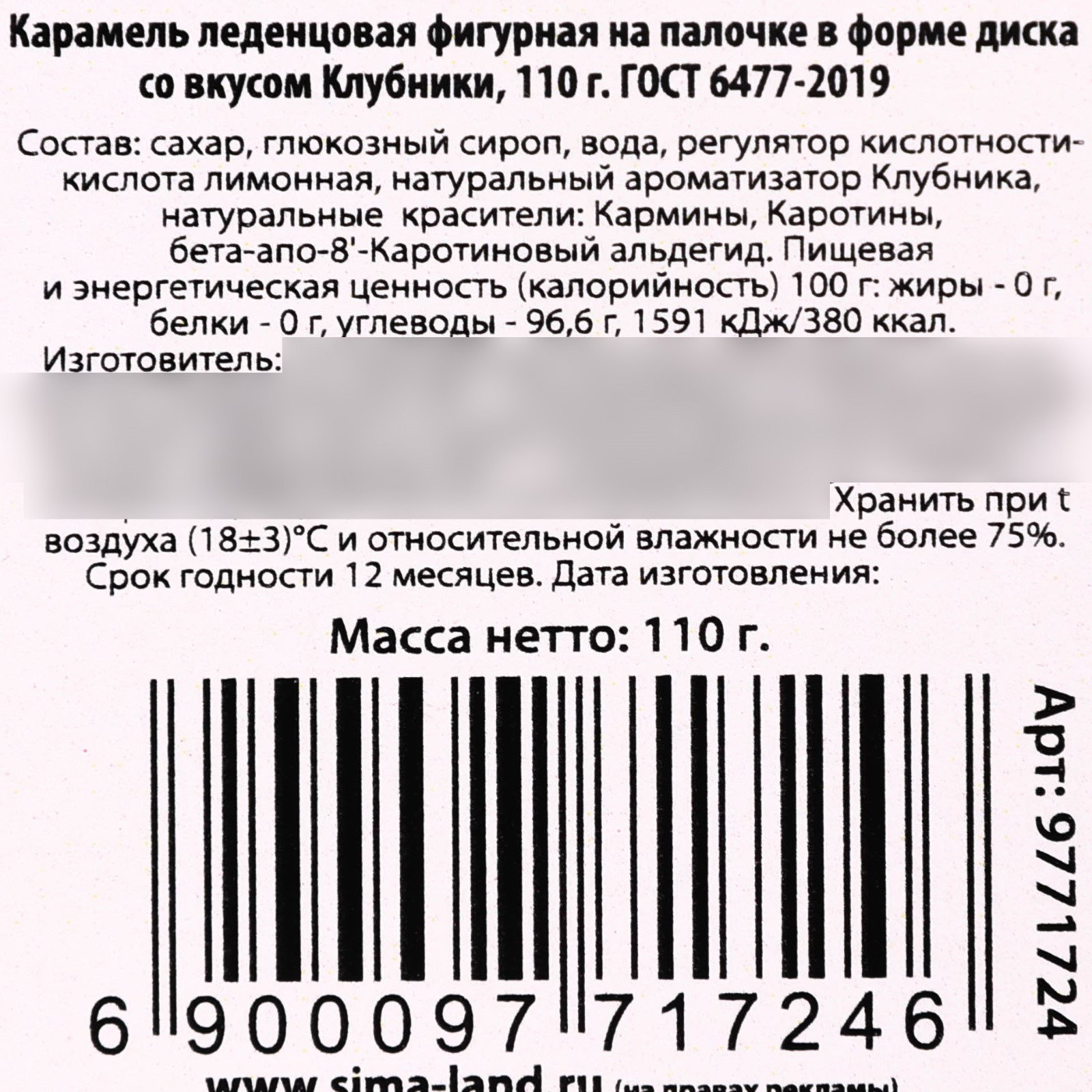 Запрет реализации по сегментам: 00000000266, 00000000593 Размер упаковки: 1 x 36.5 x 11 см. tnved: 1704907100 Новогодняя коллекция: Новый год Вес нетто, г: 110 Символ года: Нет Набор: Нет Температурное ограничение: Нет На палочке: Да Вкус: Клубника Тематика праздника: Новый год ПРИ ОФОРМЛЕНИИ ЗАКАЗА, ПРОСИМ ЗАПРАШИВАТЬ АКТУАЛЬНЫЕ СРОКИ ГОДНОСТИ У МЕНЕДЖЕРА Состав: сахар, глюкозный сироп, вода, регулятор кислотности-кислота лимонная, натуральный ароматизатор Клубника, натуральные красители: Кармины, Каротины, бета-апо-8`-Каротиновый альдегид. Срок годности: 12 месяцев Масса нетто: 110 гр | ||