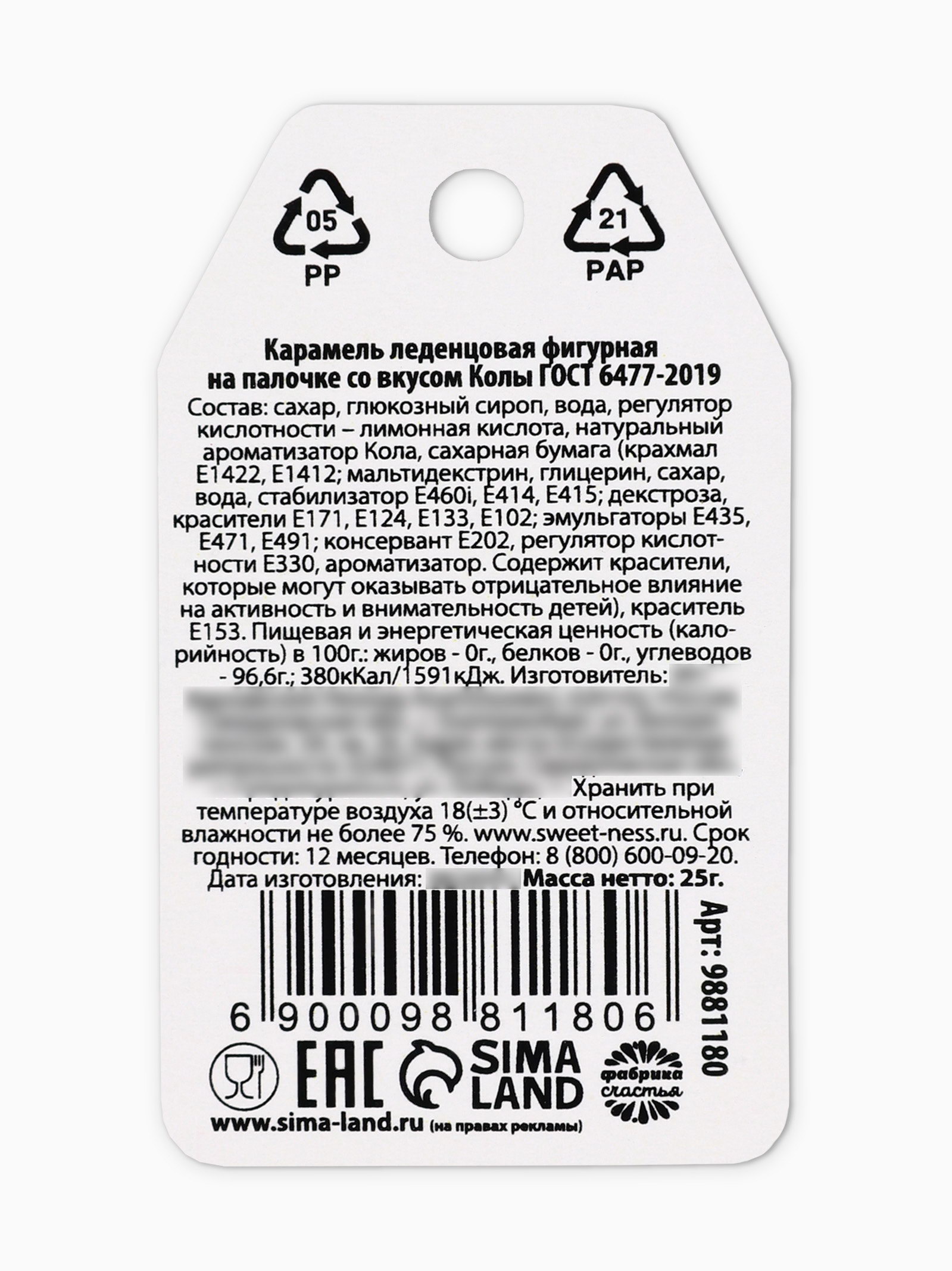 Запрет реализации по сегментам: 00000000266, 00000000593 Размер упаковки: 5.3 x 18 x 1 см. Тематика праздника: Хэллоуин tnved: 1704907100 На палочке: Да Вкус: Кола Вес нетто, г: 25 ПРИ ОФОРМЛЕНИИ ЗАКАЗА, ПРОСИМ ЗАПРАШИВАТЬ АКТУАЛЬНЫЕ СРОКИ ГОДНОСТИ У МЕНЕДЖЕРА Состав: сахар, патока, вода, лимонная кислота, краситель "Уголь растительный", ароматизатор "Кола", вафельная пищевая бумага. Срок годности: 24 месяца Масса нетто: 25 гр | ||