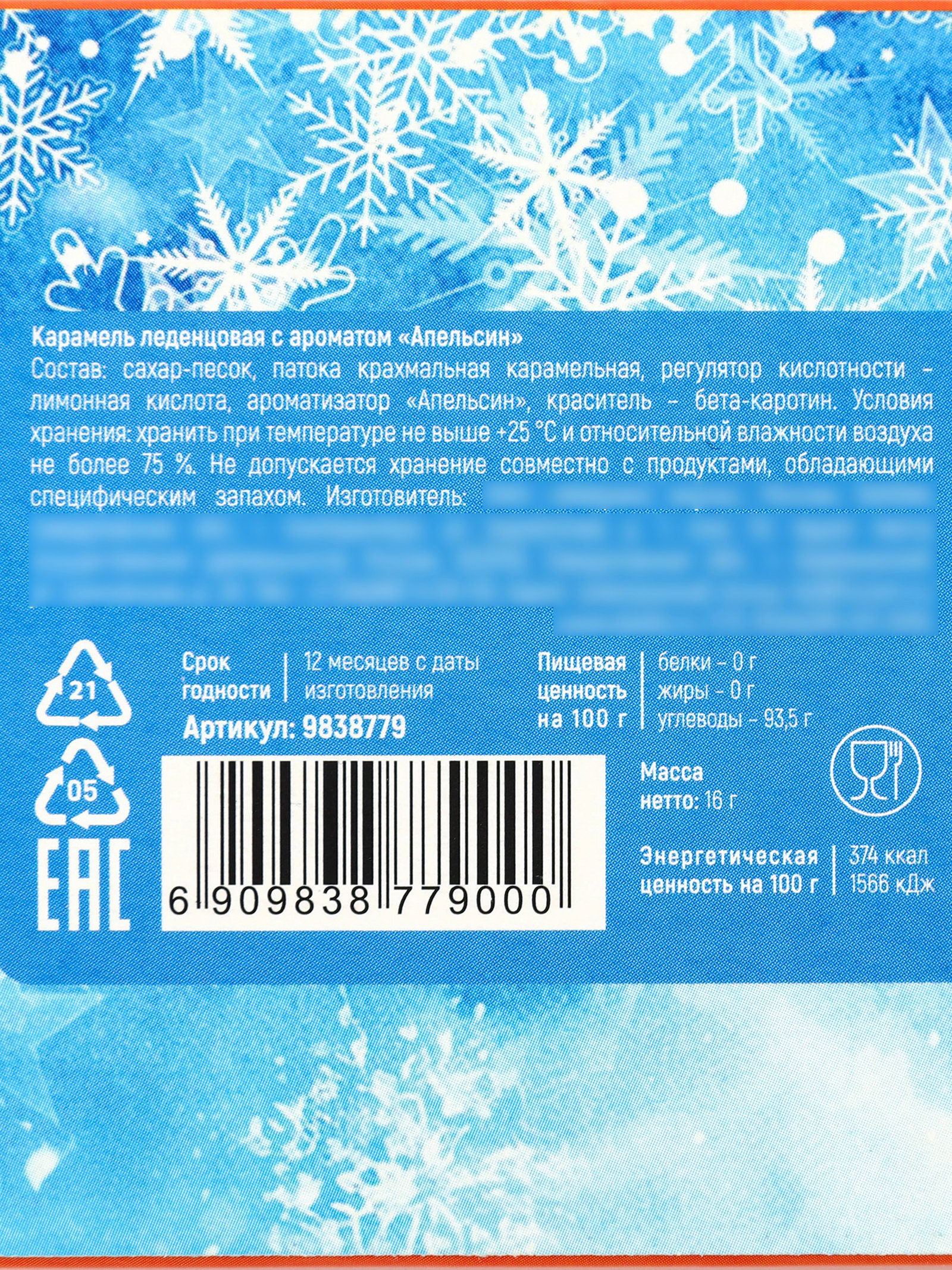 Новогодняя коллекция: Новый год, Символ года 2026 Размер упаковки: 7 x 0.5 x 10 см. Тематика: Новогодняя tnved: 1704907100 tnved: 1704907100 Запрет реализации по сегментам: 00000000266 Символ года: Символ года 2026 (Лошадь) Тематика праздника: Новый год Набор: Нет Вес нетто, г: 16 Вкус: Апельсин На палочке: Нет Температурное ограничение: Нет Леденец в новогодней тематике - это отличный, оригинальный подарок. Леденцы произведут WOW эффект на гостей, украсят любой десерт или могут стать оригинальным подарком ребёнку и взрослому. Подойдёт в качестве украшения - леденцы на торт и для украшения коктейлей. Сладость - отличное угощение для больших и взрослых любителей сладостей. Упакован в индивидуальную упаковку. Сладость имеет нежный вкус, который так нравится детям и взрослым. Выглядят ярко и оригинально! | ||