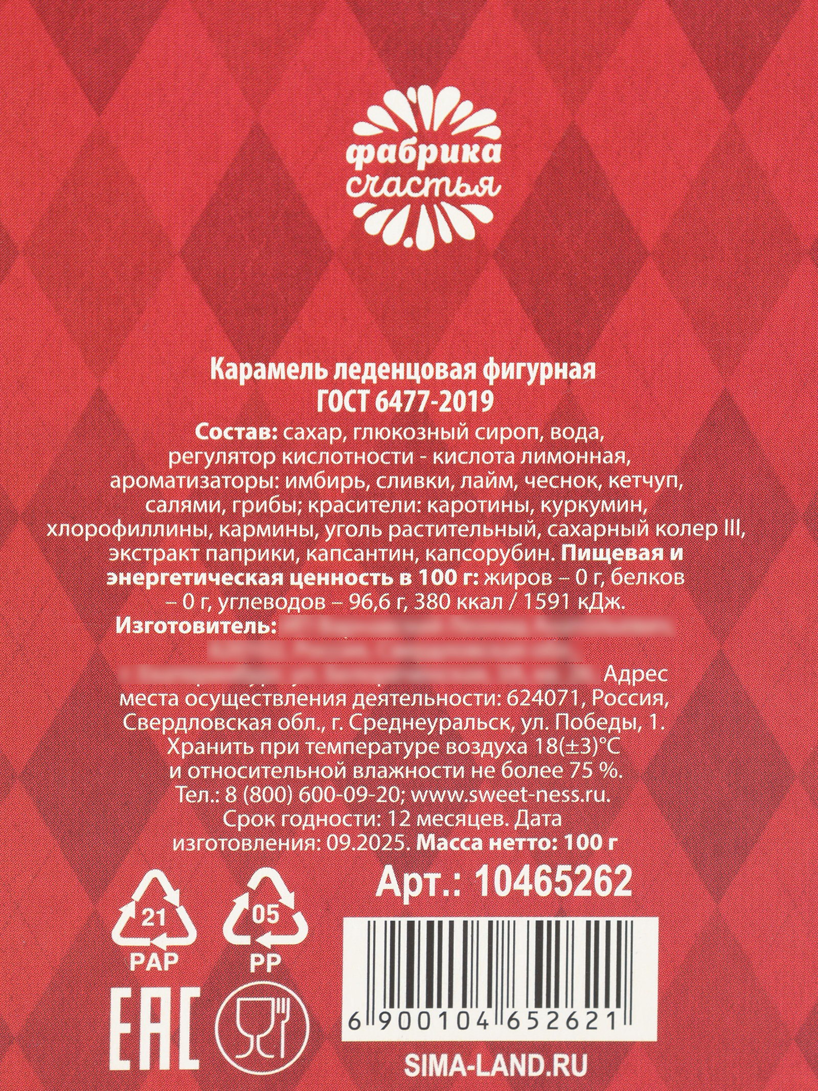 Запрет реализации по сегментам: 00000000266, 00000000593 Размер упаковки: 10.3 x 3.2 x 7.5 см. Вкус: МИКС На палочке: Нет Вес нетто, г: 100 Темпер. ограничение НЕ ВЫШЕ ℃: +23 Тематика праздника: Универсальная тематика tnved: 1704907100 При оформление заказа, просим запрашивать актуальные сроки годности у менеджераСостав: сахар, патока, лимонная кислота, натуральные красители (михром черный, хлорофилл, бета-каротин, экстракт генипы, кармин), натуральные ароматизаторы: корицы, лайма, молока, бекона, грибов, имбиря, томата, чеснока, яса, салями, кетчупа. Срок годности: 12 месяцев Масса нетто: 100 гр | ||