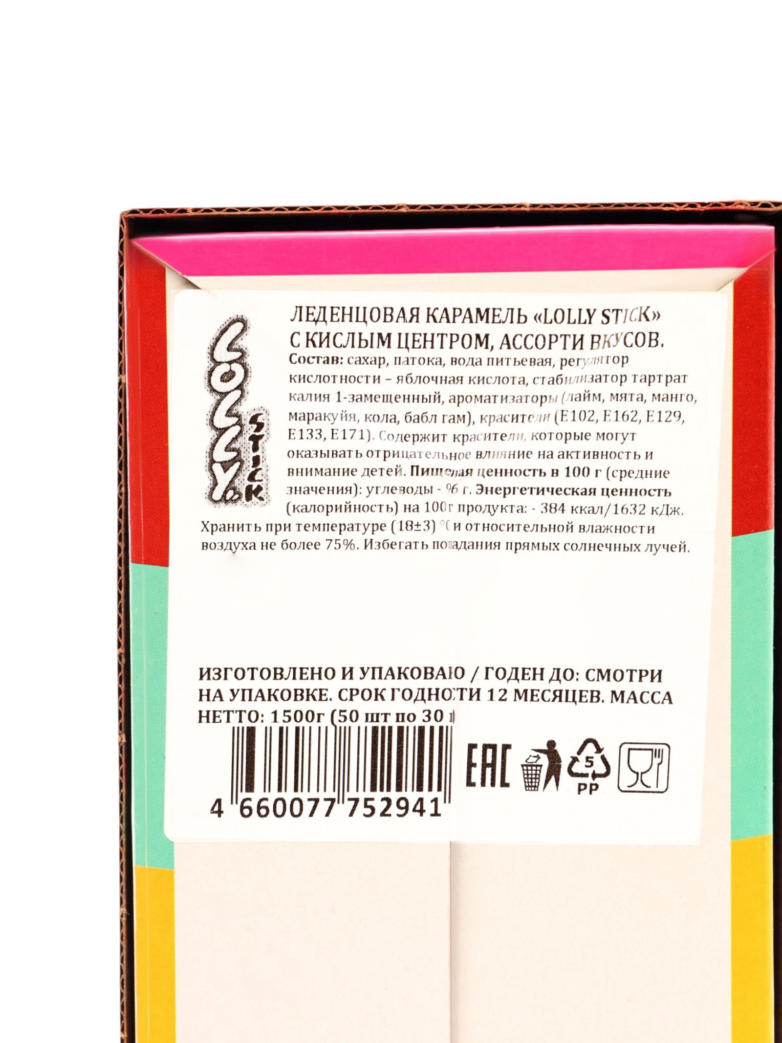 Вкус: Ассорти, Бабл-гам, Кола, Лайм, Манго, Маракуйя, Мята Размер упаковки: 2 x 1.5 x 19 см. tnved: 1704907100 Продукты: Да Температурное ограничение: Нет Вес нетто, г: 30 На палочке: Нет Тематика праздника: Универсальная тематика Яркий вкус и неожиданная начинка в одном леденце. Леденец на палочке с кислым центром - это не просто сладость, а игра вкусов. Сначала фруктовая карамель, потом взрыв кислоты внутри. Такой формат особенно нравится детям и подросткам, которые любят необычные ощущения от конфет.