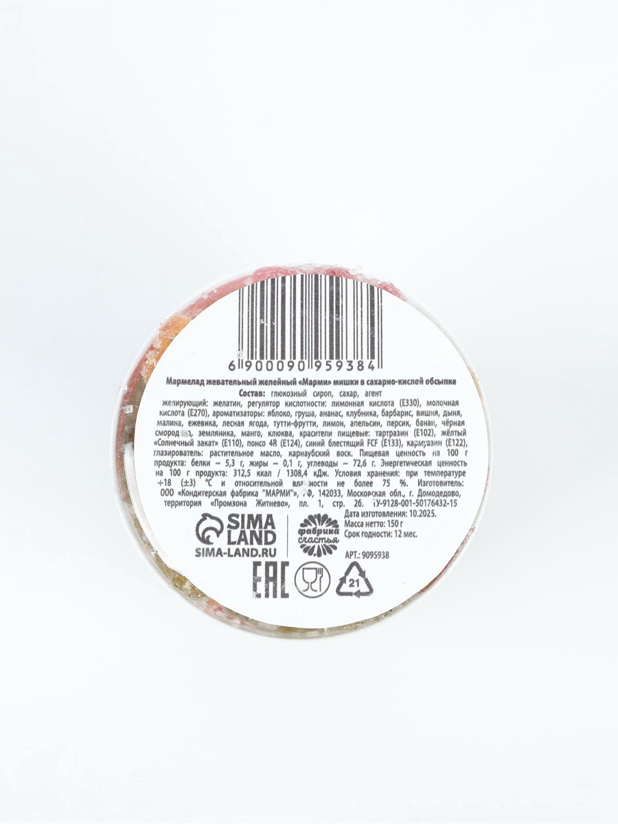 Запрет реализации по сегментам: 00000000266, 00000000593 Размер упаковки: 5.5 x 10 x 5.5 см. tnved: 1704906500 Тематика праздника: Универсальная тематика Температурное ограничение: Нет Вкус: Ассорти Вид: Жевательный Вес нетто, г: 150 Состав: глюкозный сироп; сахар; агент желирующий: желатин; регулятор кислотности: лимонная кислота (Е330), молочная кислота (Е270); ароматизаторы: яблоко, груша, ананас, клубника, барбарис, вишня, дыня, малина, ежевика, лесная ягода, тутти-фрутти, лимон, апельсин, персик, банан, черная смородина, земляника, манго, клюква; красители пищевые: тартразин (E102), желтый "солнечный закат" (Е110), понсо 4R (Е124), синий блестящий FCF (Е133), кармуазин (Е122); глазирователь: растительное масло, карнаубский воск. Масса нетто: 150 г Срок годности: 12 месяцев | ||