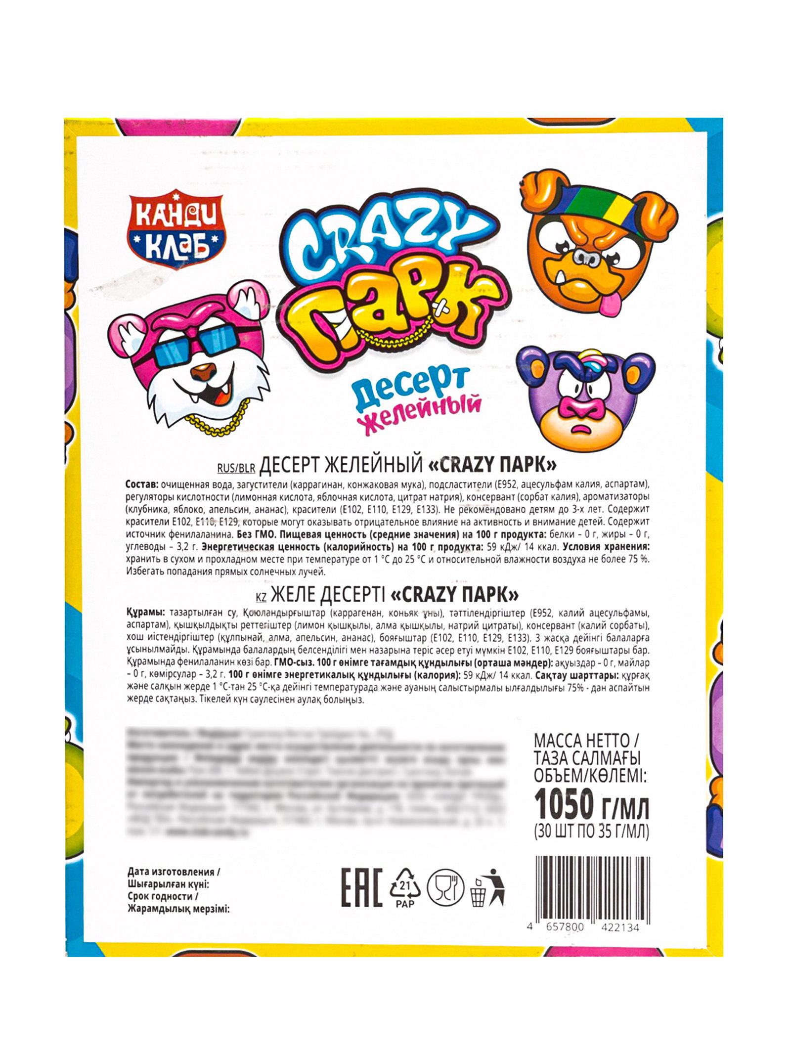 Размер упаковки: 8.5 x 1 x 10 см. tnved: 1704906500 Продукты: Да Температурное ограничение: Нет Желейный десерт Crazy Парк (35 мл) - это небольшая фруктовая сладость в оригинальной упаковке, который удобно взять с собой в школу, на прогулку или добавить к детскому празднику.