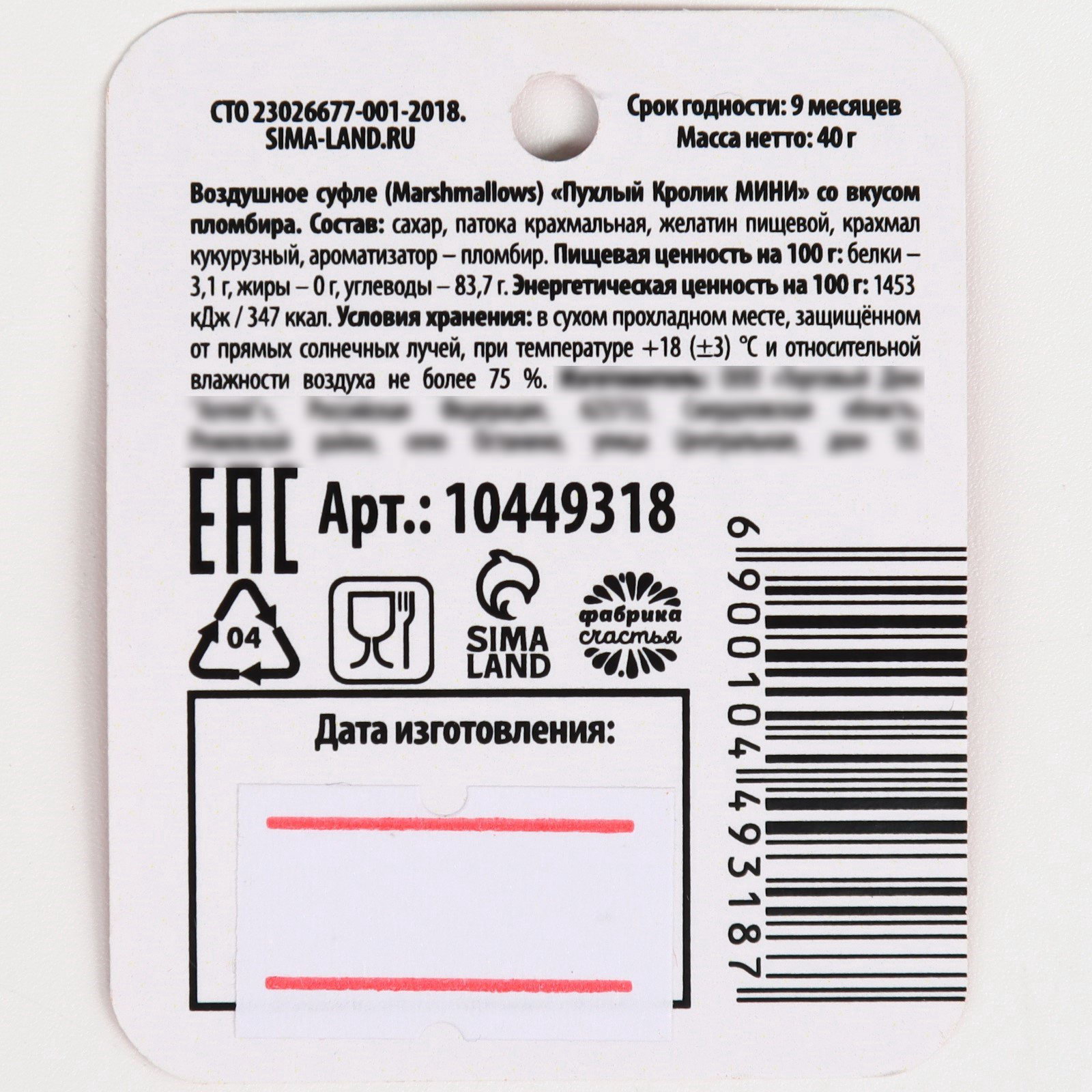 Запрет реализации по сегментам: 00000000266, 00000000593 Размер упаковки: 14 x 4 x 17 см. Вид упаковки: Пакет Вес нетто, г: 40 Вкус: Пломбир Тематика праздника: Новый год tnved: 1704909800 tnved: 1704909800 Символ года: Нет Новогодняя коллекция: Новый год ПРИ ОФОРМЛЕНИИ ЗАКАЗА, ПРОСИМ ЗАПРАШИВАТЬ АКТУАЛЬНЫЕ СРОКИ ГОДНОСТИ У МЕНЕДЖЕРА Состав: сахар, патока крахмальная, желатин пищевой, крахмал кукурузный, ароматизатор – пломбир. Пищевая ценность на 100 г: белки – 3,1 г, жиры – 0 г, углеводы – 83,7 гр Энергетическая ценность на 100 г: 1 453 кДж / 347 ккал. Условия хранения: в сухом прохладном месте, защищённом от прямых солнечных лучей, при температуре +18 (±3) ℃ и относительной влажности воздуха не более 75 %. Срок годности: 9 месяцев. Масса нетто: 40 г | ||