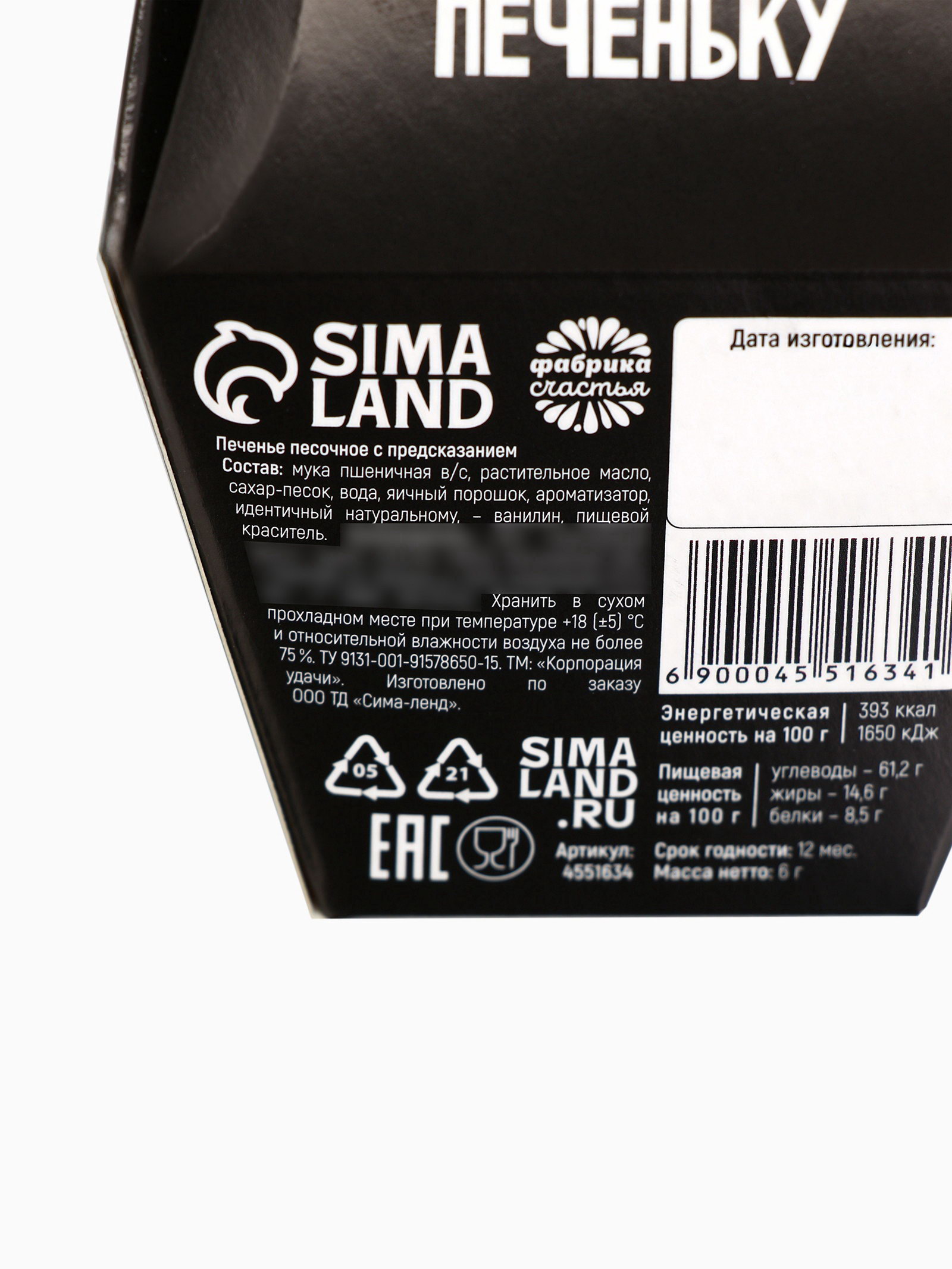 Запрет реализации по сегментам: 00000000266, 00000000593 Размер упаковки: 7 x 9.5 x 7 см. Темпер. ограничение НЕ ВЫШЕ ℃: +18 tnved: 1806321000 Вес нетто, г: 6 Тематика праздника: Универсальная тематика Вид: С предсказанием Вид упаковки: Подарочная коробка Тип: Песочное При оформление заказа, просим запрашивать актуальные сроки годности у менеджераСостав: мука пшеничная в/с, растительное масло, сахар, вода питьевая, яичный порошок, ароматизатор. Масса нетто: 6 гр Срок годности: 12 месяцев | ||