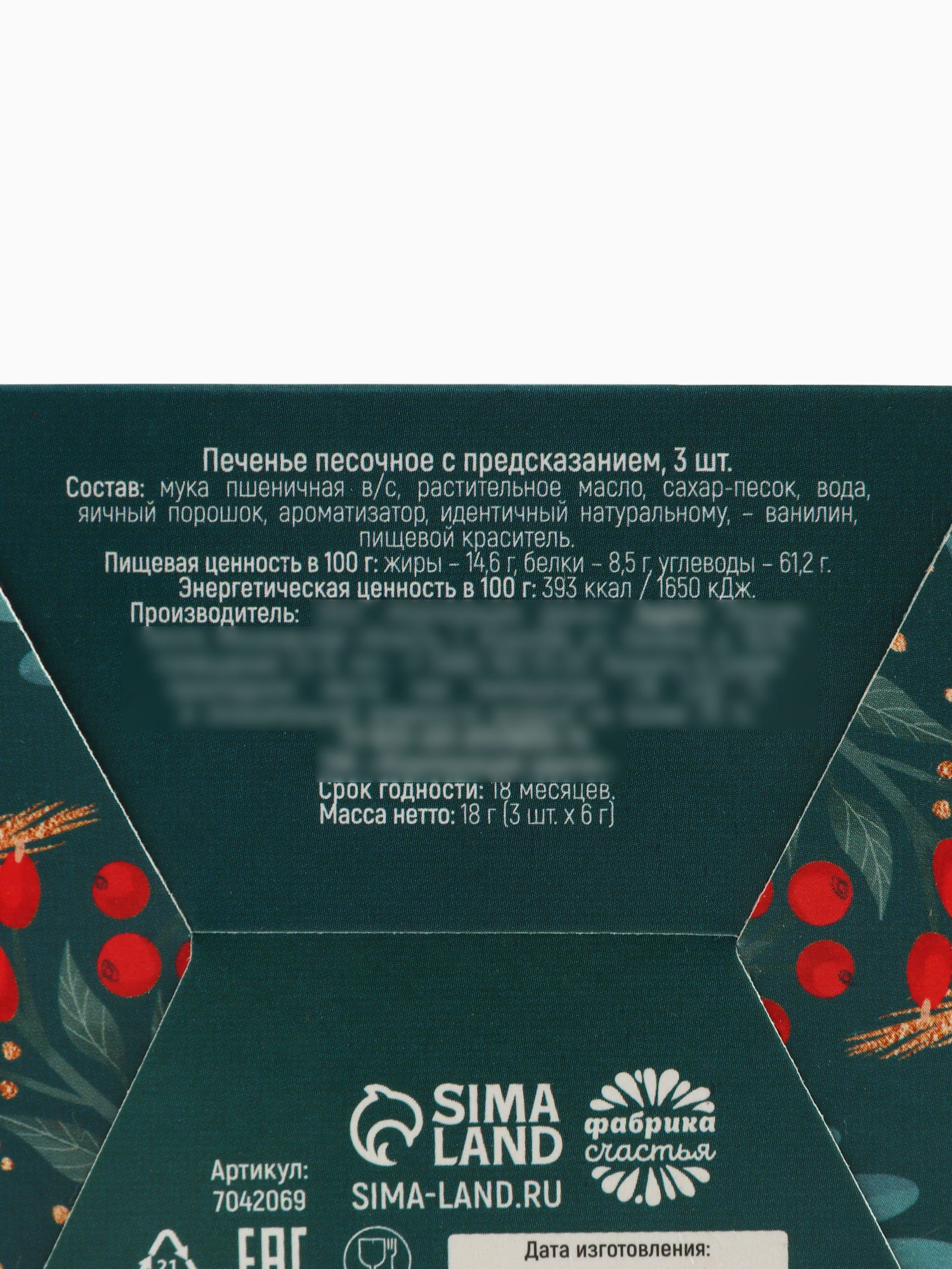 Запрет реализации по сегментам: 00000000266, 00000000593 Размер упаковки: 8 x 5 x 8 см. Вид упаковки: Подарочная коробка tnved: 1806321000 tnved: 1806321000 Символ года: Нет Новогодняя коллекция: Новый год Набор: Да Температурное ограничение: Нет Вес нетто, г: 18 Тематика праздника: Новый год Вид: С предсказанием Тип: Песочное При оформление заказа, просим запрашивать актуальные сроки годности у менеджераСостав: мука пшеничная в/с, растительное масло, сахар-песок, вода, яичный порошок, ванилин, ароматизатор, идентичный натуральному. Срок годности: 12 месяцев. Масса нетто: 18 гр | ||