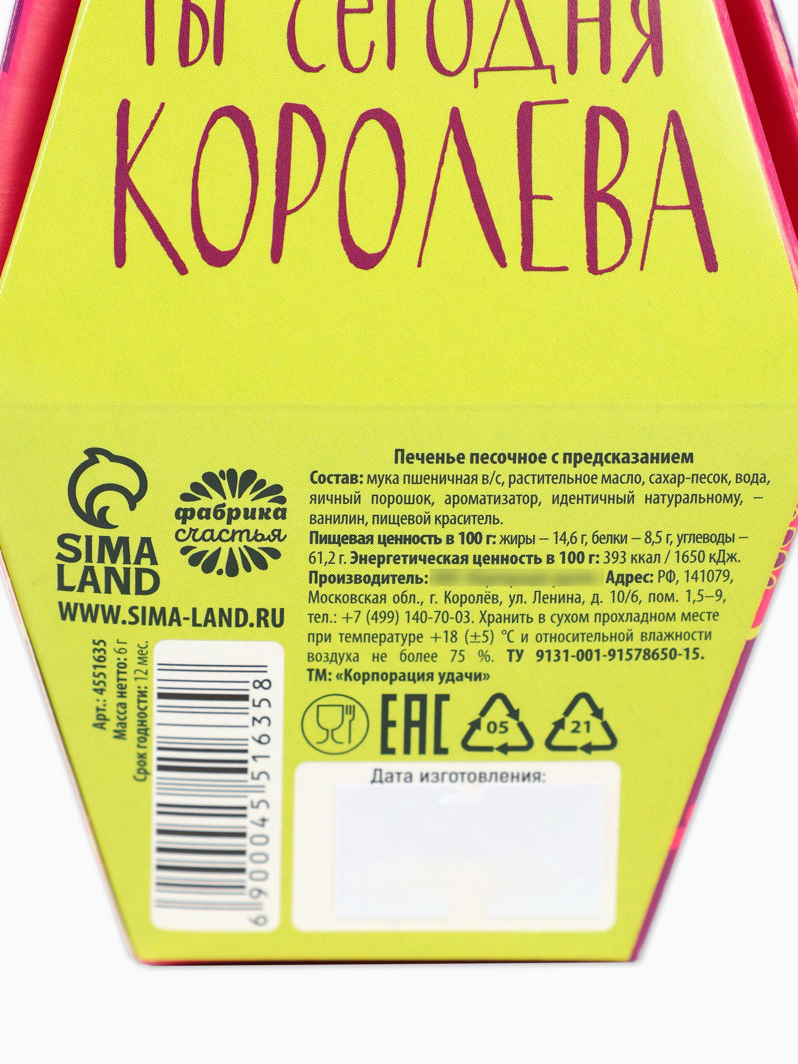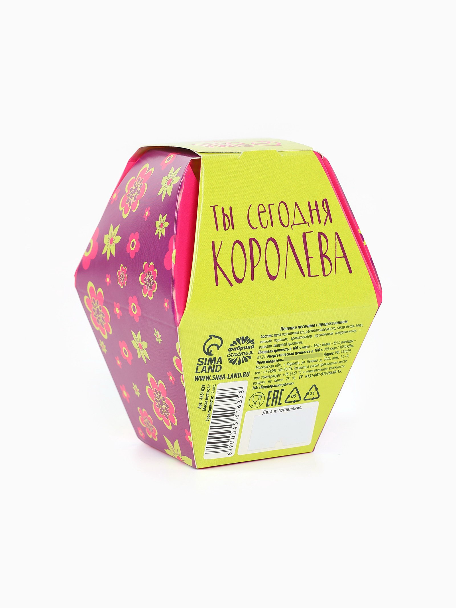 Запрет реализации по сегментам: 00000000266, 00000000593 Размер упаковки: 7 x 9.5 x 7 см. Темпер. ограничение НЕ ВЫШЕ ℃: +22 Срок годности, мес: 12 Вид упаковки: Подарочная коробка tnved: 1806321000 Для кого: Для женщины Набор: Нет Адресат: Без адресата Температурное ограничение: Нет Вес нетто, г: 6 Тематика праздника: 8 Марта Вид: С предсказанием Тип: Песочное При оформление заказа, просим запрашивать актуальные сроки годности у менеджераСостав: мука пшеничная в/с, растительное масло, сахар-песок, вода, яичный порошок, ванилин, ароматизатор, идентичный натуральному. Масса нетто: 6 гр Срок годности: 12 месяцев. | ||
