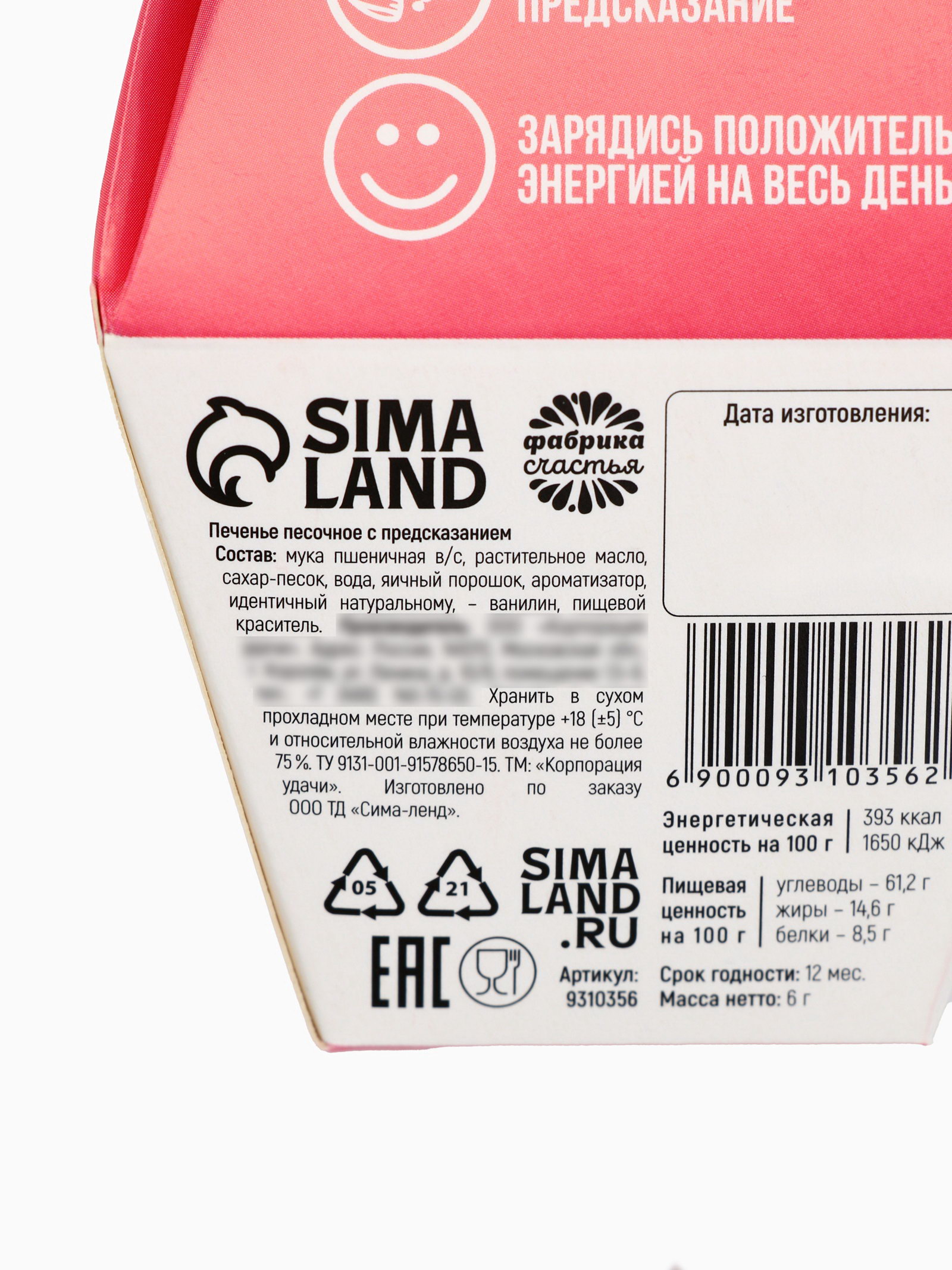 Запрет реализации по сегментам: 00000000266, 00000000593 Размер упаковки: 7 x 9.5 x 7 см. Тематика праздника: 8 Марта Темпер. ограничение НЕ ВЫШЕ ℃: +18 tnved: 1806321000 Для кого: Для женщины Температурное ограничение: Нет Вид: С предсказанием Вес нетто, г: 6 Тип: Песочное Вид упаковки: Подарочная коробка Состав: мука пшеничная в/с, растительное масло, сахар-песок, вода, яичный порошок, ванилин, ароматизатор, идентичный натуральному. Срок годности: 12 месяцев. Масса нетто: 6 грамм. | ||