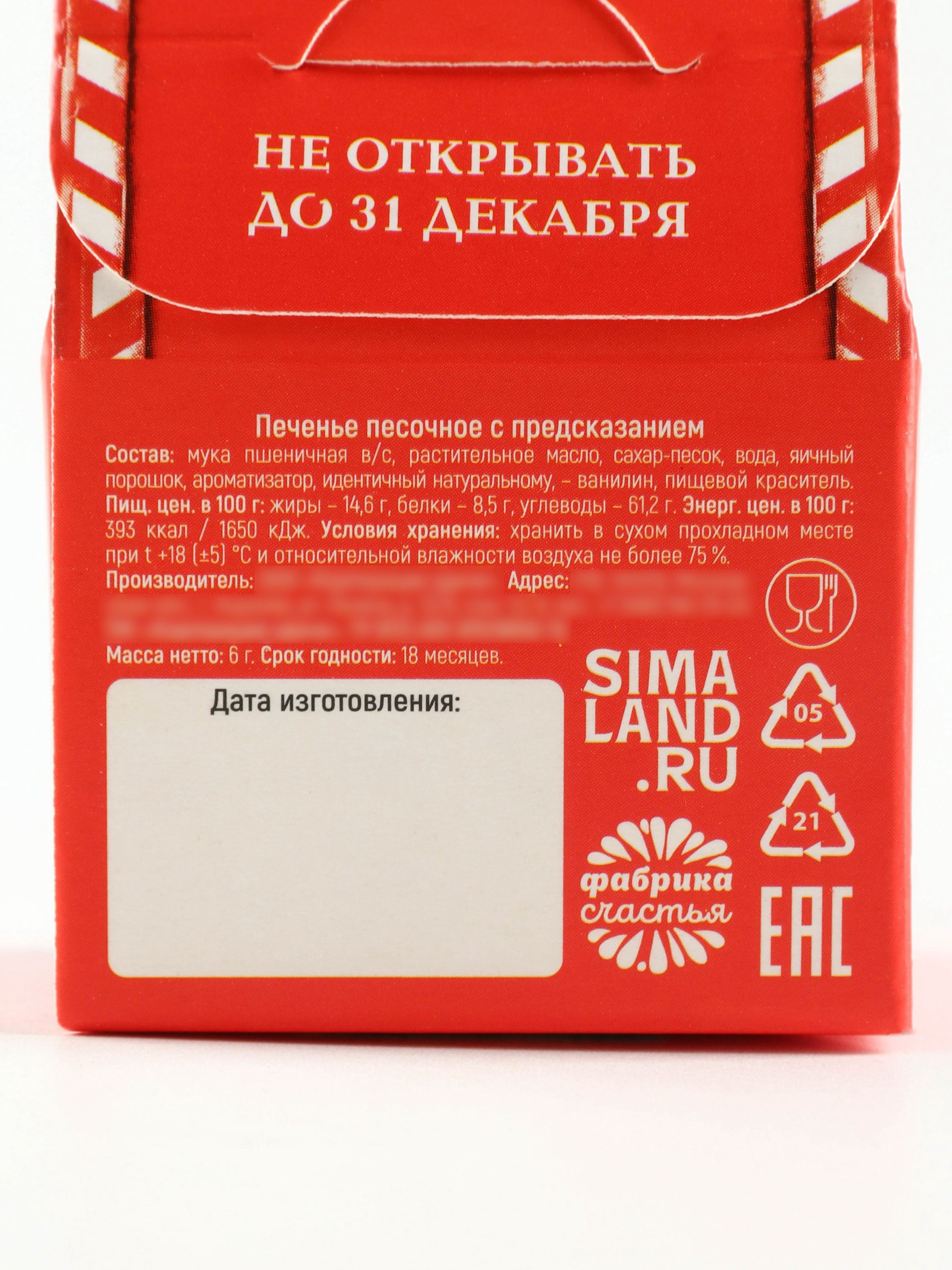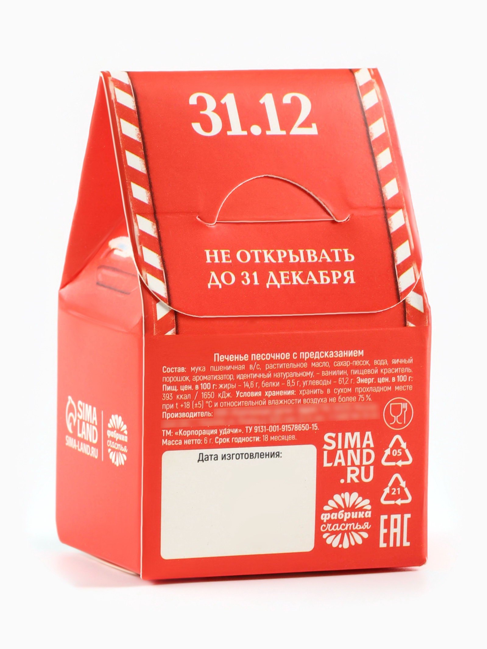 Запрет реализации по сегментам: 00000000266, 00000000593 Размер упаковки: 4.7 x 7.5 x 3.7 см. Вид упаковки: Подарочная коробка tnved: 1905320000 Символ года: Нет Новогодняя коллекция: Новый год Набор: Нет Вес нетто, г: 6 Вид: С предсказанием Тематика праздника: Новый год Тип: Песочное ПРИ ОФОРМЛЕНИИ ЗАКАЗА, ПРОСИМ ЗАПРАШИВАТЬ АКТУАЛЬНЫЕ СРОКИ ГОДНОСТИ У МЕНЕДЖЕРА Состав: мука пшеничная в/с, растительное масло, сахар-песок, вода, яичный порошок, ароматизатор, идентичный натуральному, - ванилин, пищевой краситель. Срок годности: 12 месяцев Масса нетто: 6 гр | ||
