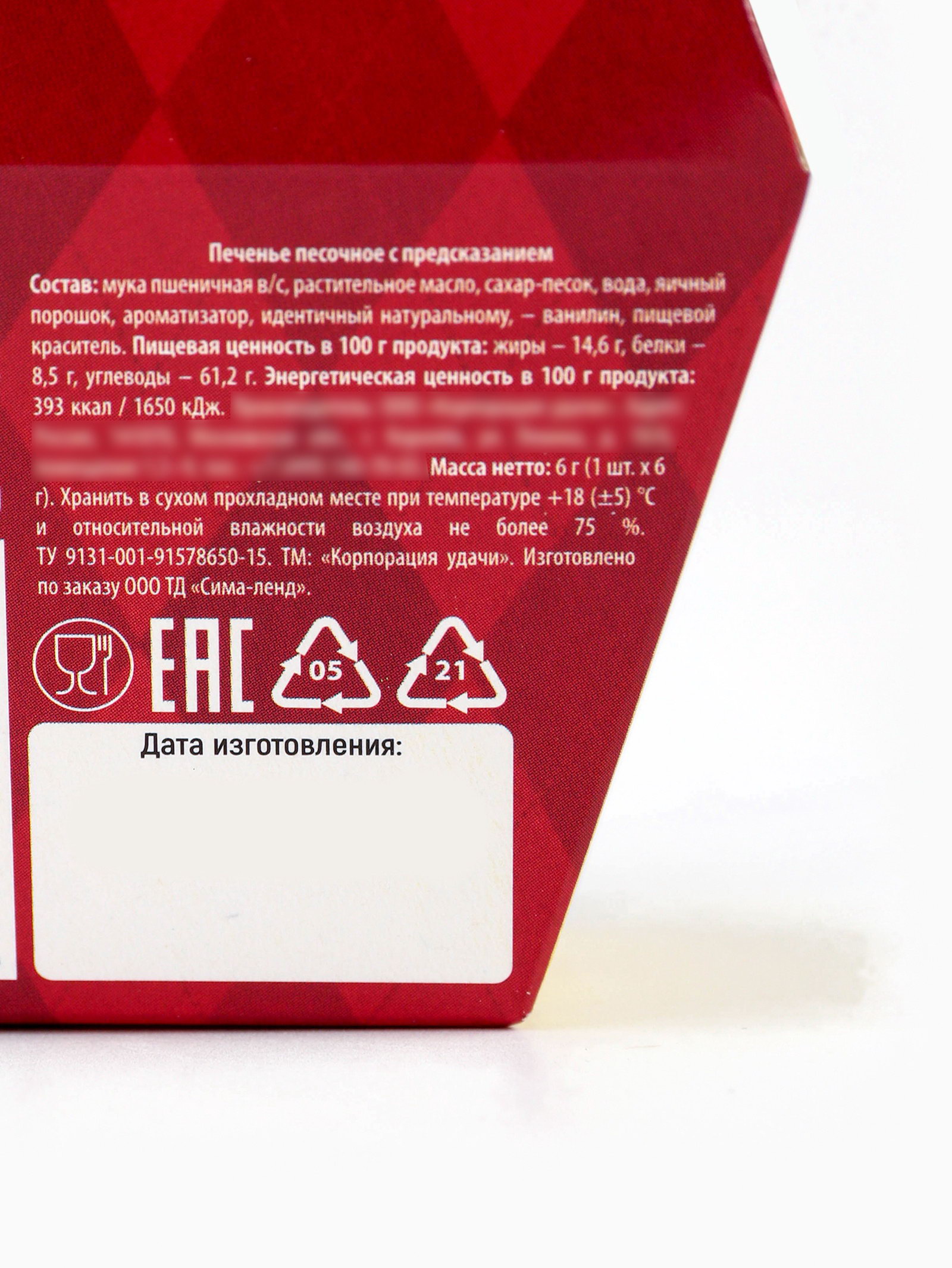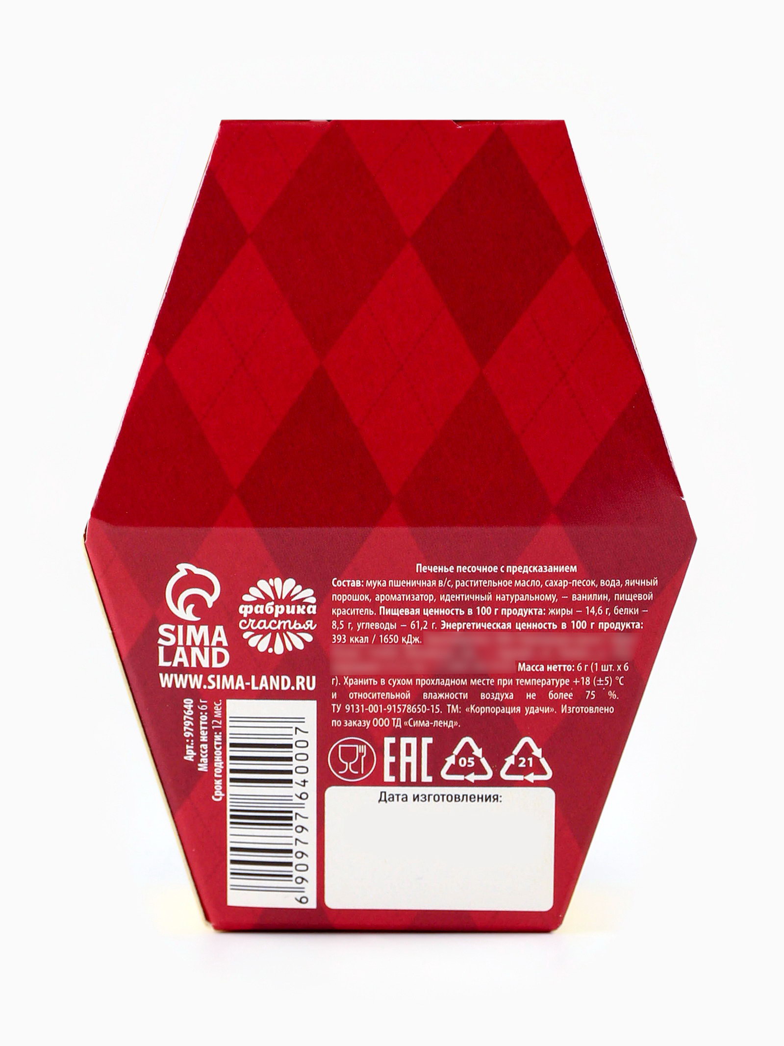 Запрет реализации по сегментам: 00000000266, 00000000593 Размер упаковки: 7 x 7 x 9 см. Вид: С предсказанием Тип: Песочное Вес нетто, г: 6 Тематика праздника: Новый год Символ года: Нет Вид упаковки: Подарочная коробка Вид упаковки: Подарочная коробка tnved: 1806321000 Новогодняя коллекция: Новый год Набор: Нет ПРИ ОФОРМЛЕНИИ ЗАКАЗА, ПРОСИМ ЗАПРАШИВАТЬ АКТУАЛЬНЫЕ СРОКИ ГОДНОСТИ У МЕНЕДЖЕРА Состав: мука пшеничная в/с, растительное масло, сахар-песок, вода, яичный порошок, ароматизатор, идентичный натуральному, - ванилин, пищевой краситель. Срок годности: 12 месяцев Масса нетто: 6 гр | ||