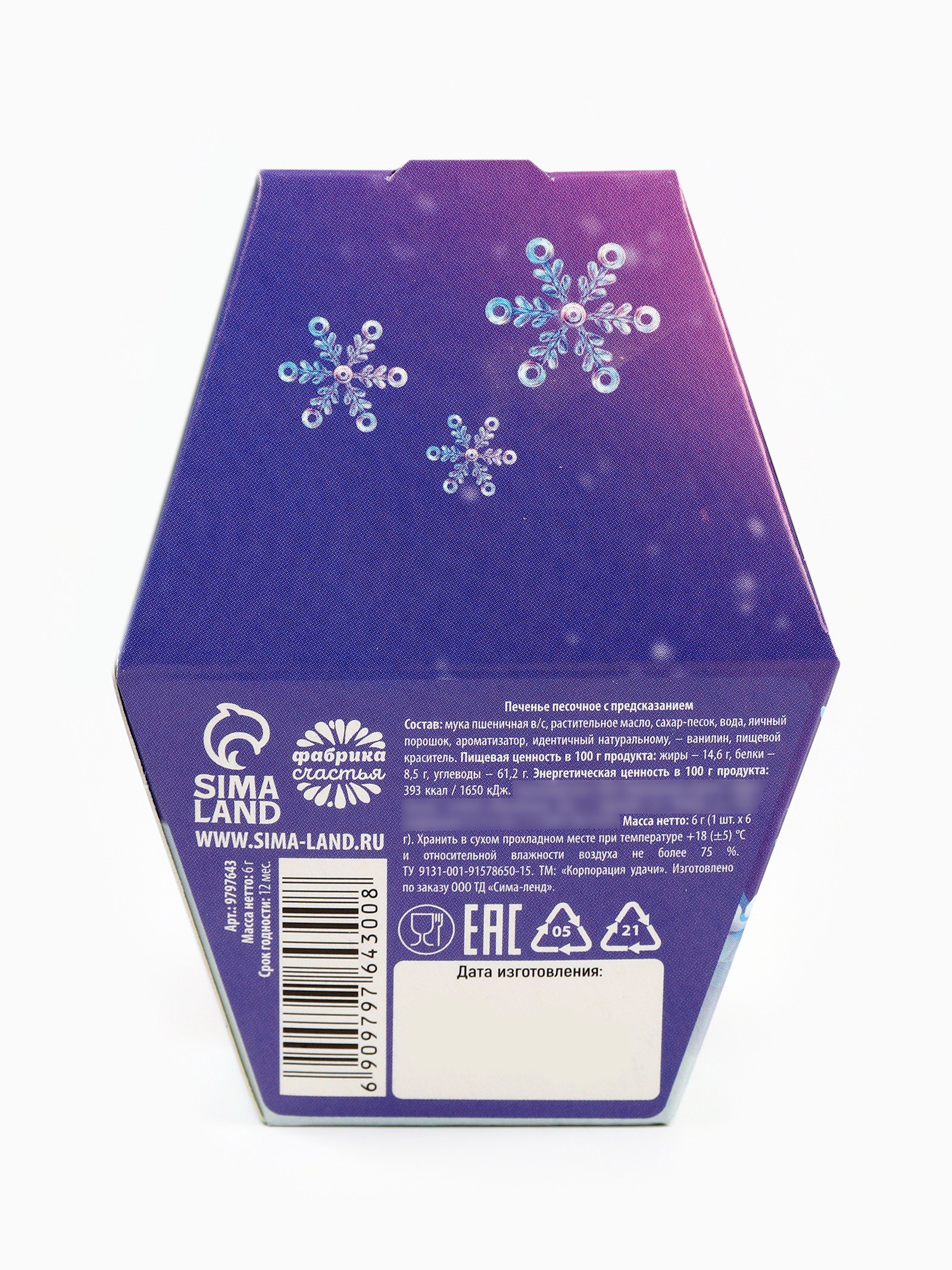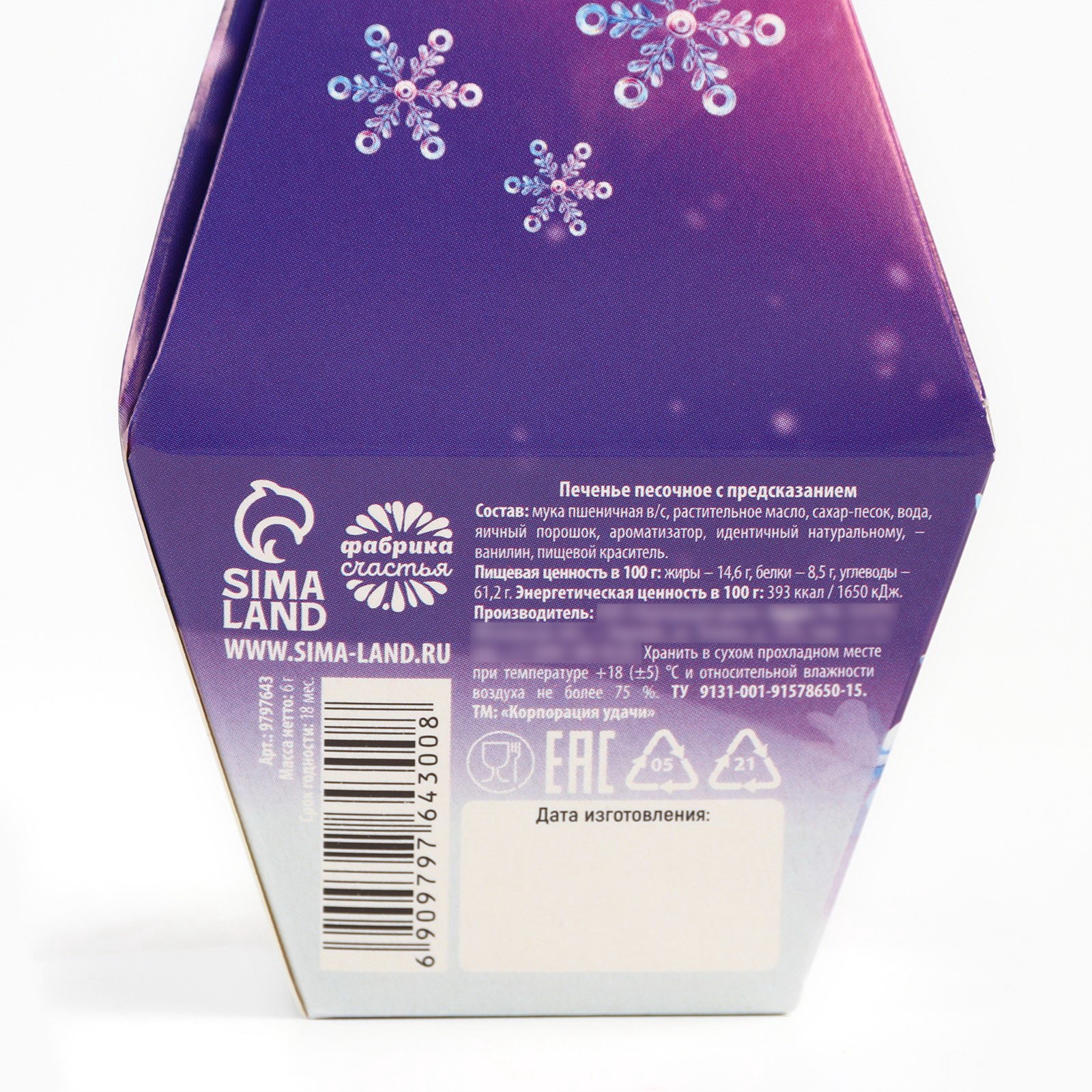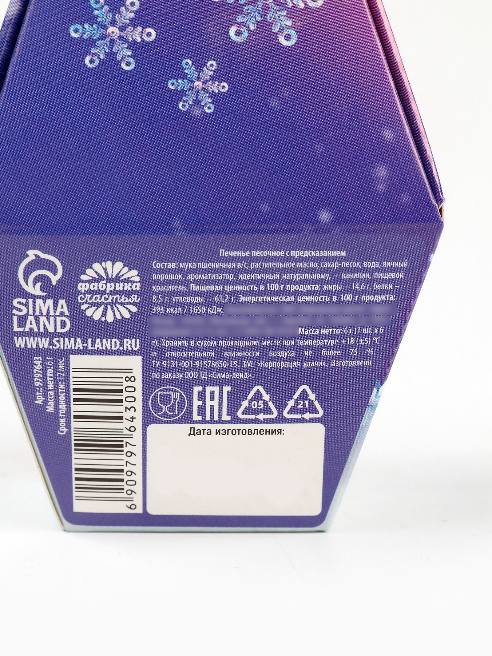 Запрет реализации по сегментам: 00000000266, 00000000593 Размер упаковки: 6.8 x 9.5 x 6.8 см. Вид: С предсказанием Тип: Песочное Вес нетто, г: 6 Темпер. ограничение НЕ ВЫШЕ ℃: +18 Тематика праздника: Новый год Вид упаковки: Подарочная коробка tnved: 1806321000 Символ года: Символ года 2026 (Лошадь) Тематика: Новогодняя ПРИ ОФОРМЛЕНИИ ЗАКАЗА, ПРОСИМ ЗАПРАШИВАТЬ АКТУАЛЬНЫЕ СРОКИ ГОДНОСТИ У МЕНЕДЖЕРА Состав: мука пшеничная в/с, растительное масло, сахар-песок, вода, яичный порошок, ароматизатор, идентичный натуральному, - ванилин, пищевой краситель. Срок годности: 12 месяцев , Масса нетто: 6 гр | ||