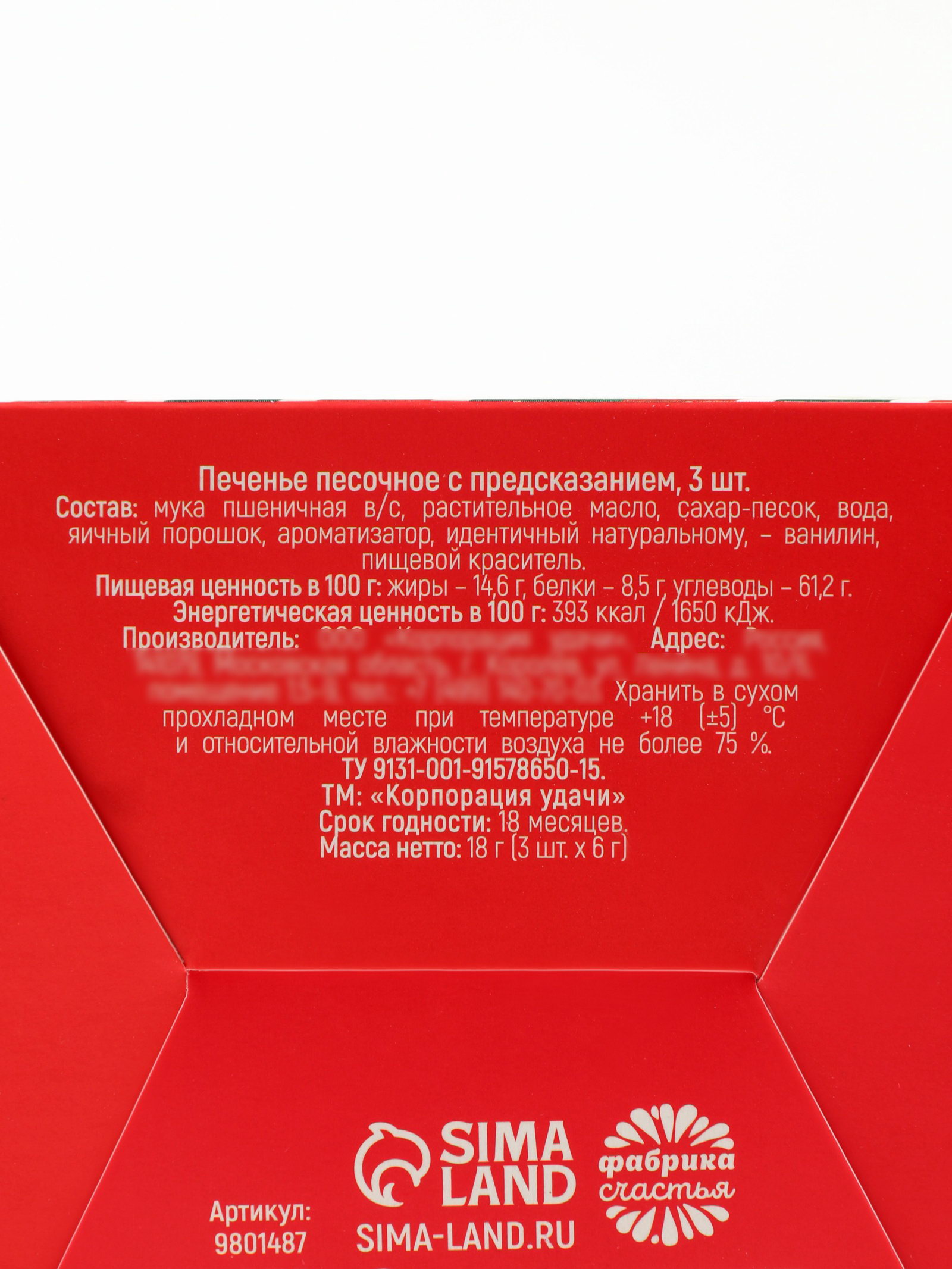 Запрет реализации по сегментам: 00000000266, 00000000593 Размер упаковки: 8 x 5 x 8 см. Вес нетто, г: 18 Тип: Песочное Вид: С предсказанием Тематика праздника: Новый год Вид упаковки: Подарочная коробка tnved: 1806321000 tnved: 1806321000 Символ года: Нет Новогодняя коллекция: Новый год Набор: Да ПРИ ОФОРМЛЕНИИ ЗАКАЗА, ПРОСИМ ЗАПРАШИВАТЬ АКТУАЛЬНЫЕ СРОКИ ГОДНОСТИ У МЕНЕДЖЕРА Состав: мука пшеничная в/с, растительное масло, сахар-песок, вода, яичный порошок, ароматизатор, идентичный натуральному, - ванилин, пищевой краситель. Срок годности: 18 месяцев Масса нетто: 18 г (3 шт. x 6 г). | ||