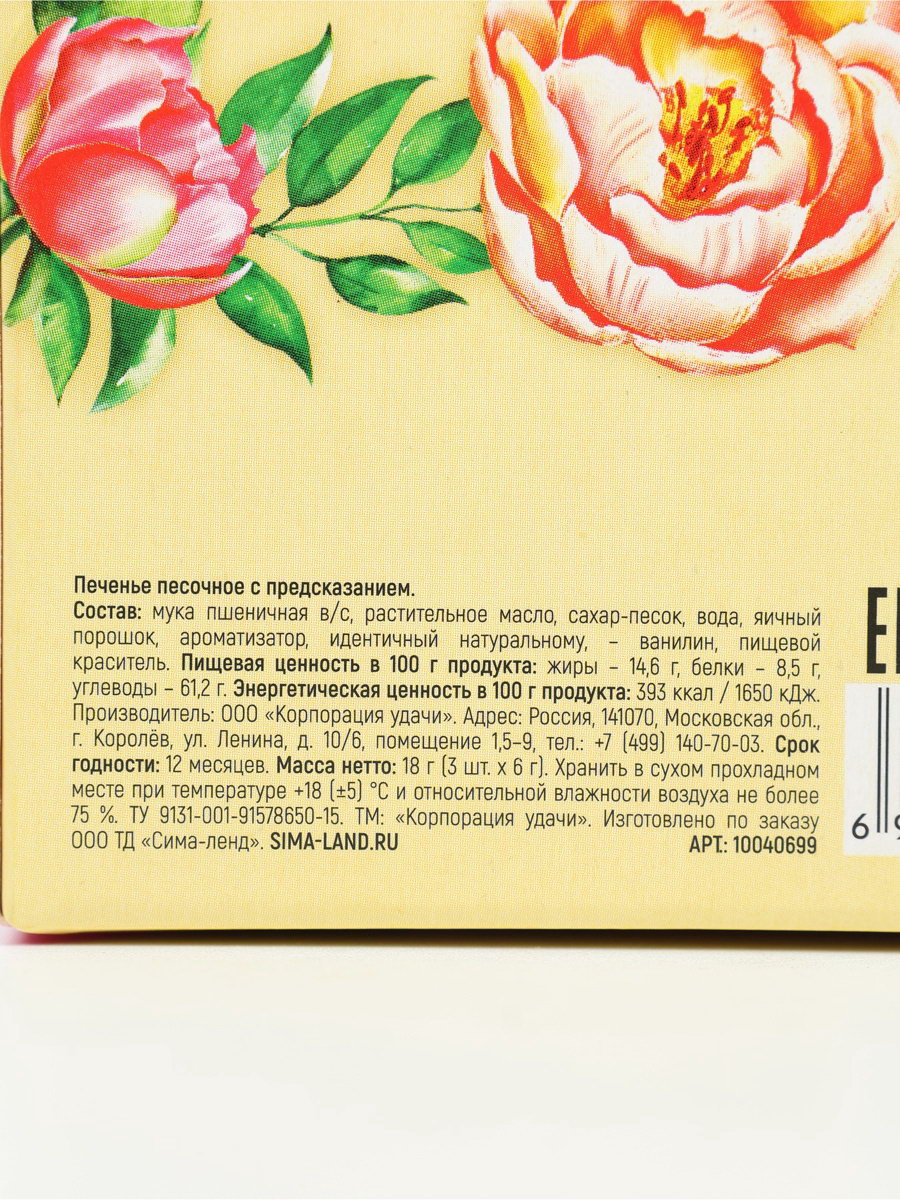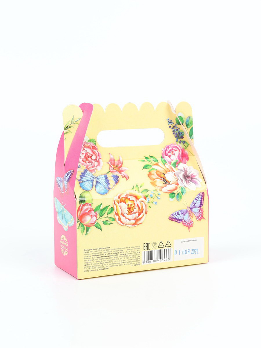 Запрет реализации по сегментам: 00000000266, 00000000593 Размер упаковки: 4.5 x 12 x 10.5 см. Вес нетто, г: 18 Тип: Песочное Вид упаковки: Подарочная коробка Тематика праздника: 8 Марта Тематика подарка: Продукты питания tnved: 1905320000 ПРИ ОФОРМЛЕНИИ ЗАКАЗА, ПРОСИМ ЗАПРАШИВАТЬ АКТУАЛЬНЫЕ СРОКИ ГОДНОСТИ У МЕНЕДЖЕРА Состав: мука пшеничная в/с, растительное масло, сахар-песок, вода, яичный порошок, ароматизатор, идентичный натуральному, - ванилин, пищевой краситель. Срок годности: 12 месяцев Масса нетто: 18 г (3 шт. x 6 г). | ||
