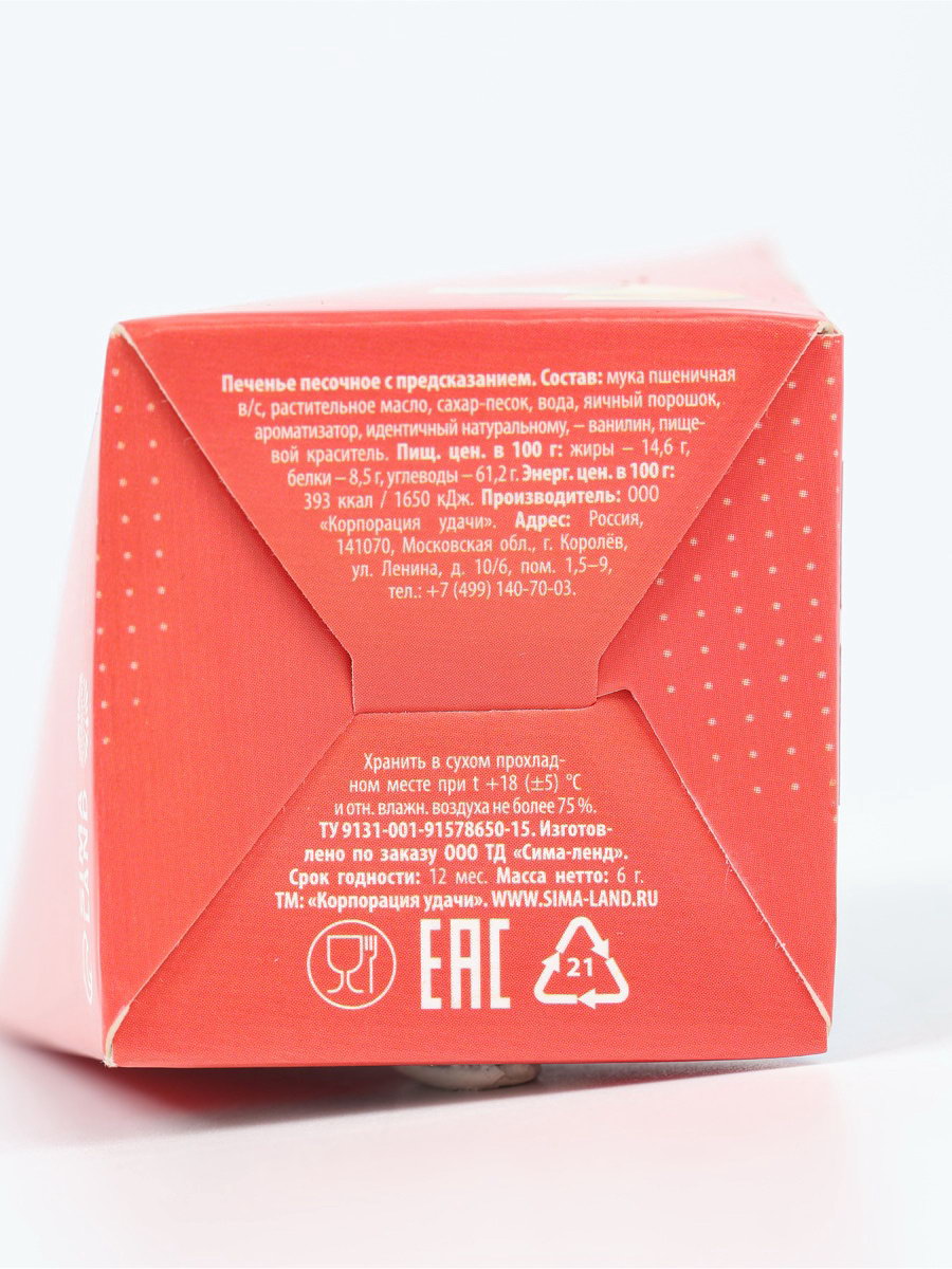 Запрет реализации по сегментам: 00000000266, 00000000593 Размер упаковки: 7 x 5 x 10 см. Температурное ограничение: Нет Вес нетто, г: 15 Вид упаковки: Коробка картонная Тип: Песочное tnved: 1806321000 Тематика праздника: Универсальная тематика Адресат: Без адресата Это печенье представляет собой небольшое хрустящее лакомство, в которое запечен листочек с предсказанием. Дизайнерская упаковка точно порадует любого мальчика или мужчину своим внешним видом в День защитника Отечества. Печенье может стать не только вкусным десертом, но и отличным вариантом подарка близкому человеку. Он обязательно оценит неординарный подход, а оригинальное предсказание-сюрприз оставит после себя массу положительных эмоций! Печенье с предсказанием в оригинальной подарочной упаковке - станет отличным дополнением к основному подарку на 23 февраля. Этим замечательным и необычным подарком можно выразить любовь, сказать о том, как вы дорожите любимым человеком. Также печенье с предсказанием - это хороший способ порадовать самого близкого и любимого человека просто так. | ||
