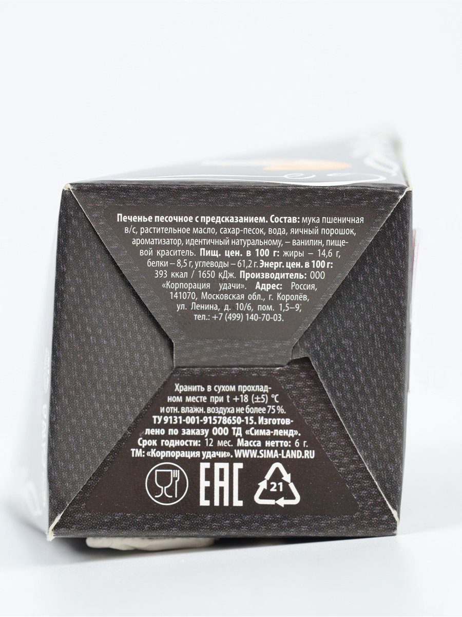Запрет реализации по сегментам: 00000000266, 00000000593 Размер упаковки: 7 x 5 x 10 см. Вес нетто, г: 15 Температурное ограничение: Нет Вид упаковки: Коробка картонная Тип: Песочное tnved: 1806321000 Тематика праздника: Универсальная тематика Это печенье представляет собой небольшое хрустящее лакомство, в которое запечен листочек с предсказанием. Дизайнерская упаковка точно порадует любого мальчика или мужчину своим внешним видом в День защитника Отечества. Печенье может стать не только вкусным десертом, но и отличным вариантом подарка близкому человеку. Он обязательно оценит неординарный подход, а оригинальное предсказание-сюрприз оставит после себя массу положительных эмоций! Печенье с предсказанием в оригинальной подарочной упаковке - станет отличным дополнением к основному подарку на 23 февраля. Этим замечательным и необычным подарком можно выразить любовь, сказать о том, как вы дорожите любимым человеком. Также печенье с предсказанием - это хороший способ порадовать самого близкого и любимого человека просто так. | ||