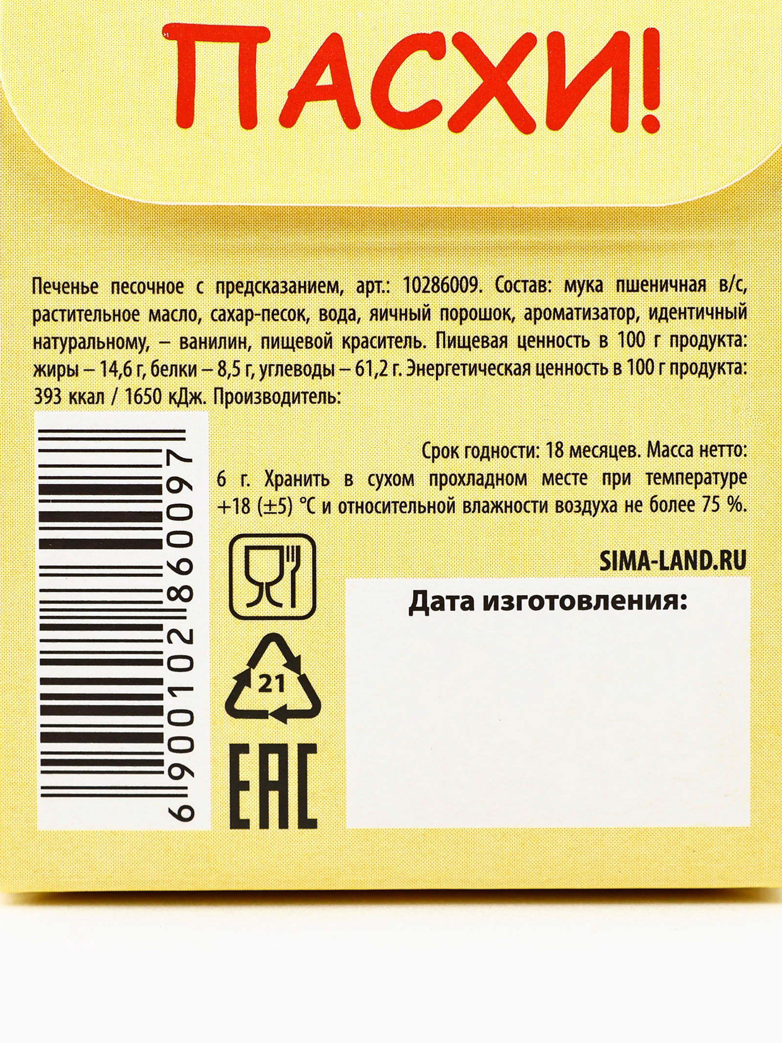 Запрет реализации по сегментам: 00000000266, 00000000593 Размер упаковки: 3.8 x 4.8 x 7.5 см. Вид упаковки: Подарочная коробка Тип: Песочное Вид: С предсказанием Вес нетто, г: 6 Тематика праздника: Пасха tnved: 1905320000 tnved: 1905320000 ПРИ ОФОРМЛЕНИИ ЗАКАЗА, ПРОСИМ ЗАПРАШИВАТЬ АКТУАЛЬНЫЕ СРОКИ ГОДНОСТИ У МЕНЕДЖЕРА Состав: мука пшеничная в/с, растительное масло, сахар-песок, вода, яичный порошок, ароматизатор, идентичный натуральному, - ванилин, пищевой краситель. Срок годности: 18 месяцев Масса нетто: 6 гр | ||
