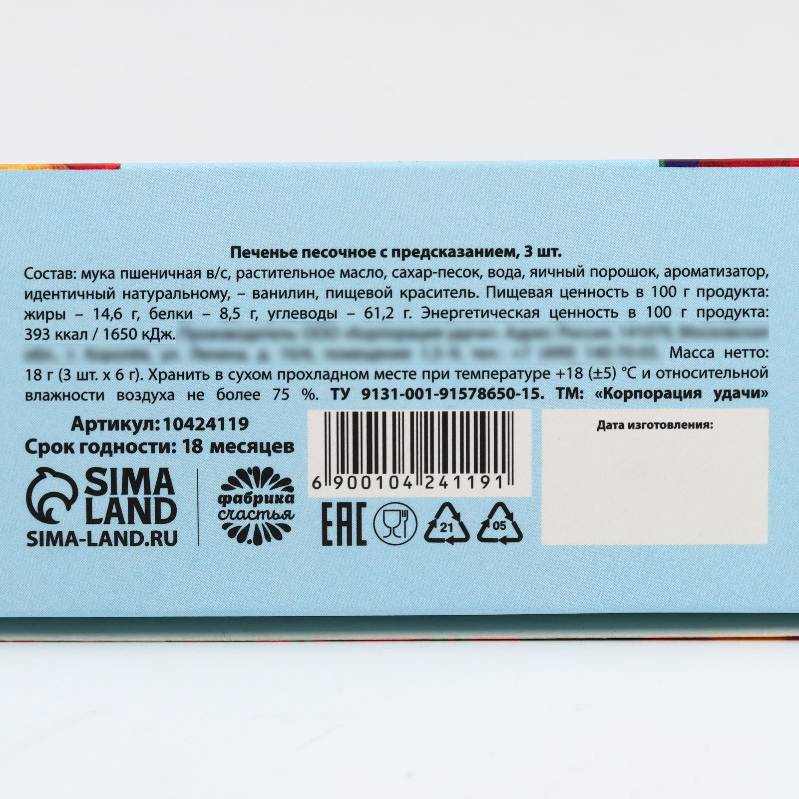 Запрет реализации по сегментам: 00000000266, 00000000593 Размер упаковки: 9 x 5 x 16 см. Тип: Песочное Вид: С предсказанием Тематика праздника: Новый год Тематика праздника: Новый год tnved: 1905320000 Вес нетто, г: 18 Вид упаковки: Подарочная коробка Символ года: Нет Новогодняя коллекция: Новый год Набор: Да ПРИ ОФОРМЛЕНИИ ЗАКАЗА, ПРОСИМ ЗАПРАШИВАТЬ АКТУАЛЬНЫЕ СРОКИ ГОДНОСТИ У МЕНЕДЖЕРА Состав: мука пшеничная в/с, растительное масло, сахар-песок, вода, яичный порошок, ароматизатор, идентичный натуральному, - ванилин, пищевой краситель. Срок годности: 18 месяцев Масса нетто: 6 гр | ||