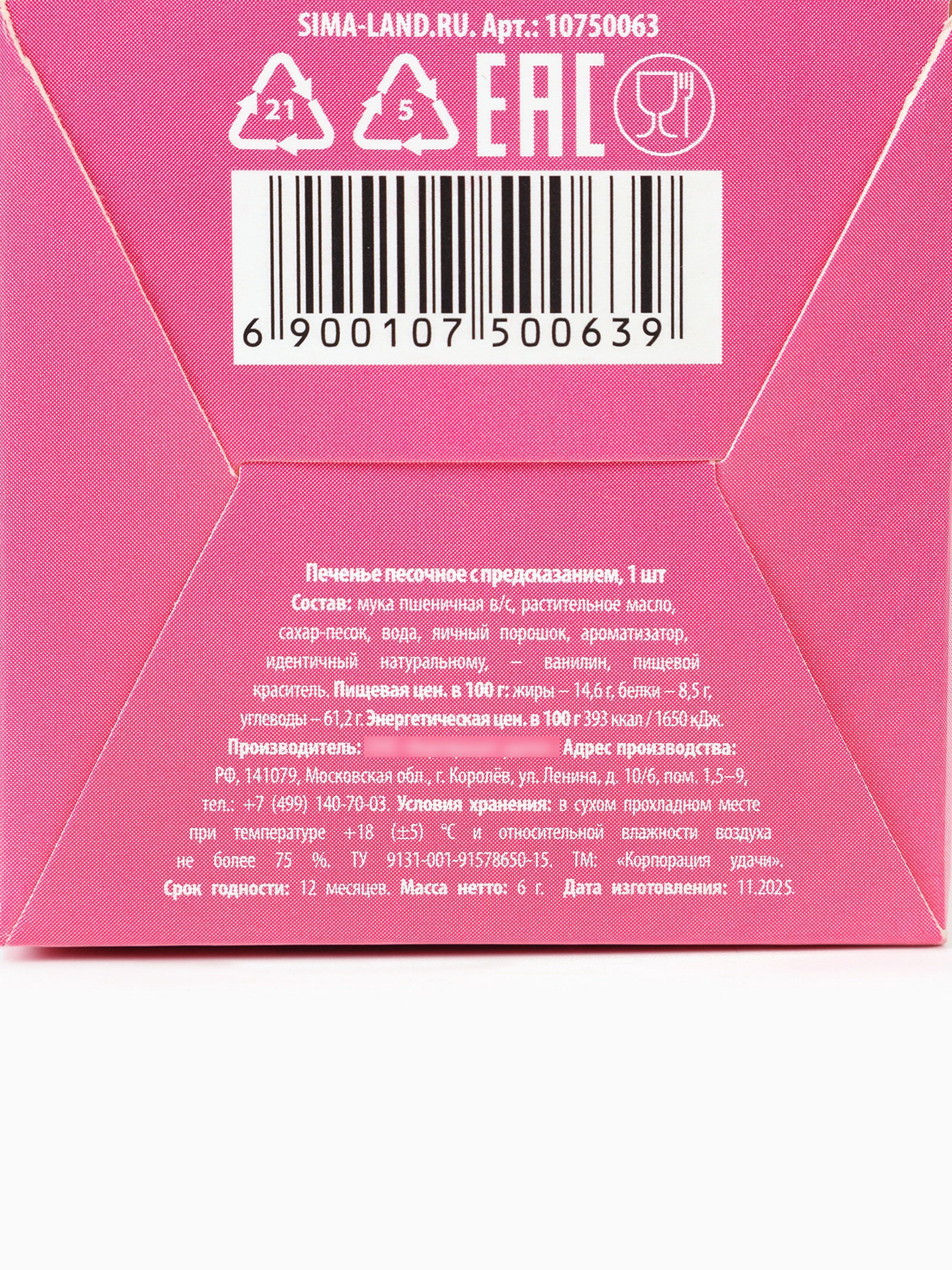 Запрет реализации по сегментам: 00000000266, 00000000593 Размер упаковки: 5 x 5 x 5 см. Тип: Песочное Вес нетто, г: 6 Вид: С предсказанием Тематика праздника: 8 Марта Вид упаковки: Подарочная коробка Срок годности, мес: 12 tnved: 1905320000 ПРИ ОФОРМЛЕНИИ ЗАКАЗА, ПРОСИМ ЗАПРАШИВАТЬ АКТУАЛЬНЫЕ СРОКИ ГОДНОСТИ У МЕНЕДЖЕРА Состав: мука пшеничная в/с, растительное масло, сахар-песок, вода, яичный порошок, ароматизатор, идентичный натуральному, – ванилин, пищевой краситель. Масса нетто: 6 гр Срок годности: 12 месяцев. | ||