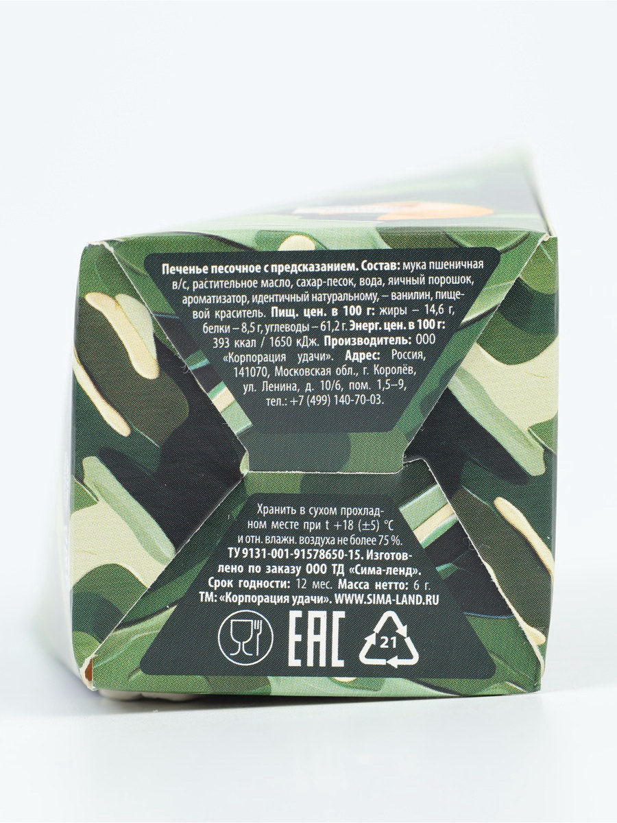 Запрет реализации по сегментам: 00000000266, 00000000593 Размер упаковки: 8 x 6 x 10 см. Температурное ограничение: Нет Вид: С предсказанием Вид упаковки: Коробка картонная Тип: Песочное Вес нетто, г: 6 Тематика праздника: 23 Февраля tnved: 1806321000 Печенье с предсказанием "23 февраля" это оригинальное и креативное угощение для праздника, которое станет отличным подарком и веселым сюрпризом для мужчин в этот важный день. Упакованное в компактные порции по 6 г, это печенье не только порадует своим вкусом, но и добавит элемент неожиданности. Каждое печенье содержит уникальное предсказание, которое может поднять настроение или вдохновить на новые свершения. Яркие и запоминающиеся фразы делают его идеальным дополнением к праздничному столу, придавая весёлое и игривое настроение. Внутри вас ждет не только хрустящее и ароматное печенье, приготовленное по традиционному рецепту, но и маленькая доля магии в виде предсказания на удачу! Печенье с предсказанием "23 февраля" станет прекрасным угощением для дружеских посиделок, корпоративов или семейных праздников. Его использовать в качестве оригинального подарка "гадания" для каждого гостя. Непременно добавьте это угощение в свой праздничный набор, и пусть предсказания приносят удачу и вдохновение каждому! | ||