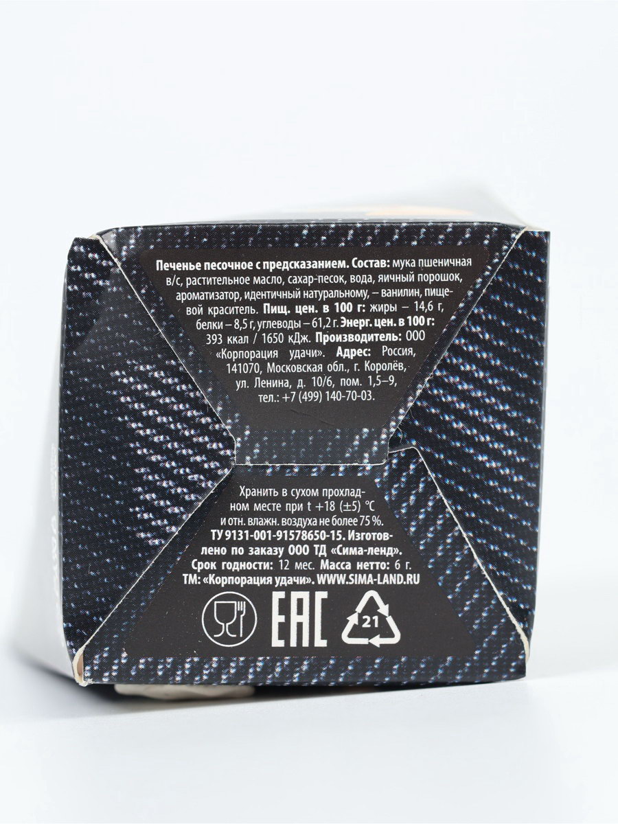 Запрет реализации по сегментам: 00000000266, 00000000593 Размер упаковки: 8 x 6 x 10 см. Температурное ограничение: Нет Вид: С предсказанием Вид упаковки: Коробка картонная Тип: Песочное Вес нетто, г: 6 Тематика праздника: 23 Февраля tnved: 1806321000 Печенье с предсказанием "День Защитника Отечества" это оригинальное и креативное угощение для праздника, которое станет отличным подарком и веселым сюрпризом для мужчин в этот важный день. Упакованное в компактные порции по 6 г, это печенье не только порадует своим вкусом, но и добавит элемент неожиданности. Каждое печенье содержит уникальное предсказание, которое может поднять настроение или вдохновить на новые свершения. Яркие и запоминающиеся фразы делают его идеальным дополнением к праздничному столу, придавая весёлое и игривое настроение. Внутри вас ждет не только хрустящее и ароматное печенье, приготовленное по традиционному рецепту, но и маленькая доля магии в виде предсказания на удачу! Печенье с предсказанием "День Защитника Отечества" станет прекрасным угощением для дружеских посиделок, корпоративов или семейных праздников. Его использовать в качестве оригинального подарка "гадания" для каждого гостя. Непременно добавьте это угощение в свой праздничный набор, и пусть предсказания приносят удачу и вдохновение каждому! | ||