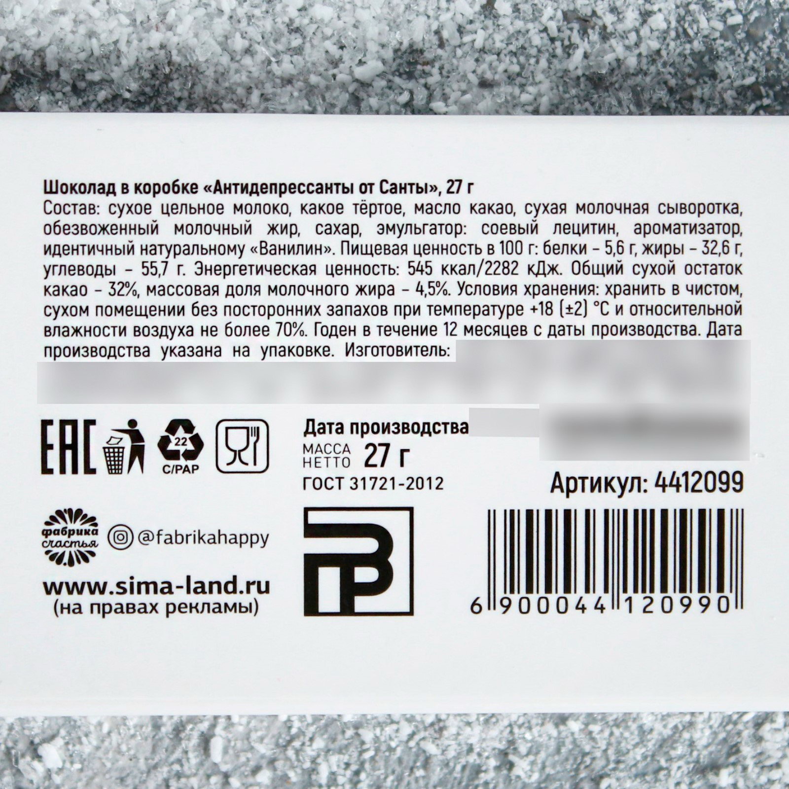 Шоколад новогодний "Антидепрессанты от Санты", 27 г в коробке, Фабрика счастья, Россия