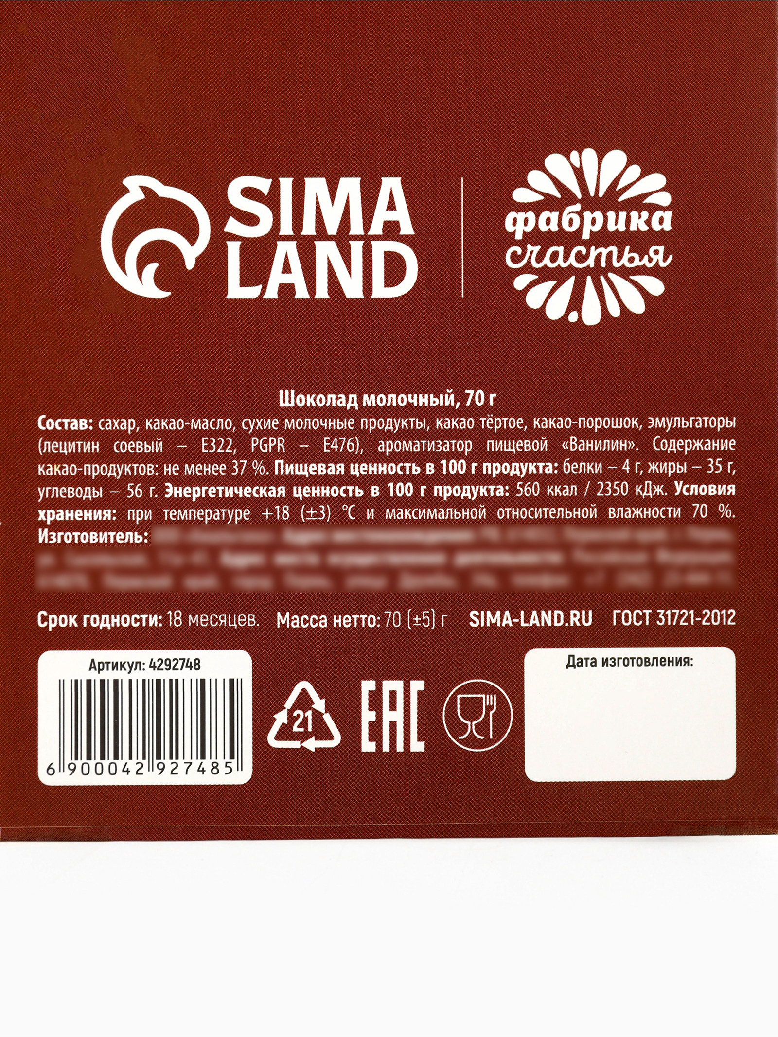 Запрет реализации по сегментам: 00000000266, 00000000593 Размер упаковки: 10.5 x 2.5 x 20.5 см. Тематика праздника: Новый год Тематика праздника: Новый год tnved: 1806329000 Вес нетто, г: 70 Символ года: Нет Новогодняя коллекция: Новый год Температурное ограничение: Нет Форма: Плитка Вид шоколада: Молочный Добавки: Без добавок Белки, г: 4 Жиры, г: 35 Углеводы, г: 56 Энергетическая ценность, ккал: 560 При оформление заказа, просим запрашивать актуальные сроки годности у менеджера Состав: сахар, какао - масло, сухие молочные продукты, какао тёртое, какао - порошок, эмульгаторы (лецитин соевый - Е322, PGPR), ароматизатор пищевой "Ванилин". Содержание какао - продуктов: не менее 37%. Пищевая ценность в 100 г: белки - 4 г, жиры - 35 г, углеводы - 56 гр Энергетическая ценность в 100 г: 560 ккал/2350 кДж. Срок годности: 12 месяцев Масса нетто: 70 г | ||
