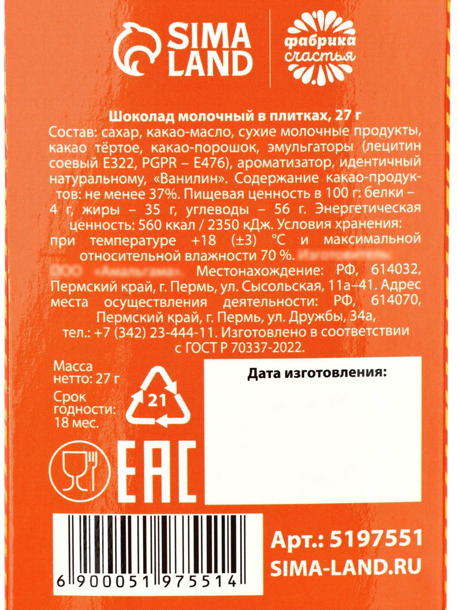 Запрет реализации по сегментам: 00000000266, 00000000593 Размер упаковки: 5.2 x 1 x 9.3 см. Темпер. ограничение НЕ ВЫШЕ ℃: +18 Темпер. ограничение НЕ НИЖЕ ℃: +5 Срок годности, мес: 12 Тематика праздника: Универсальная тематика tnved: 1806901900 tnved: 1806901900 Добавки: Без добавок Форма: Мини-плитка Вид шоколада: Молочный Вес нетто, г: 27 Энергетическая ценность, ккал: 545 Жиры, г: 32.6 Белки, г: 5.6 Углеводы, г: 55.7 При оформление заказа, просим запрашивать актуальные сроки годности у менеджераСостав: сухое цельное молоко, какао тёртое, масло какао, сухая молочная сыворотка, обезвоженный молочный жир, сахар, эмульгатор – соевый лецитин, ароматизатор, идентичный натуральному, "Ванилин". Годен в течение 12 месяцев с даты производства. Дата производства указана на упаковке. Масса нетто: 27 г | ||