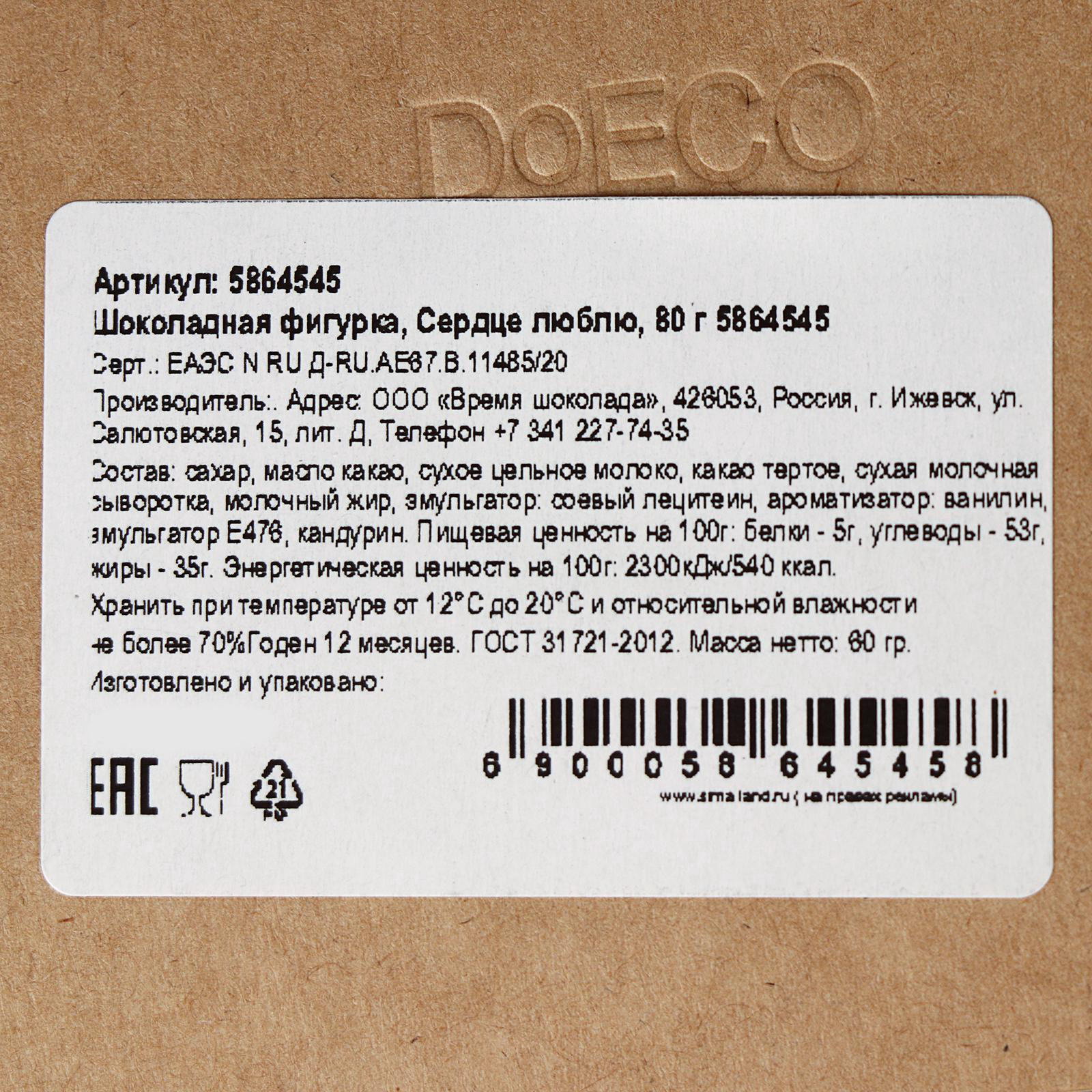 Размер упаковки: 12 x 5 x 15 см. tnved: 1806201000 Вес нетто, г: 80 Продукты: Да Температурное ограничение: Нет Добавки: Без добавок Вид шоколада: Молочный Тематика праздника: 14 Февраля Форма: Фигурка Энергетическая ценность, ккал: 540 Жиры, г: 35 Углеводы, г: 53 Белки, г: 5 Шоколадные фигурки станут отличным подарком или дополнением к основному презенту. Сюрприз получится красивым и действительно вкусным. Вручить такой подарок можно на праздники или просто так, а вкус и аромат шоколада принесет множество положительных эмоций и надолго запомнится своей оригинальностью! | ||