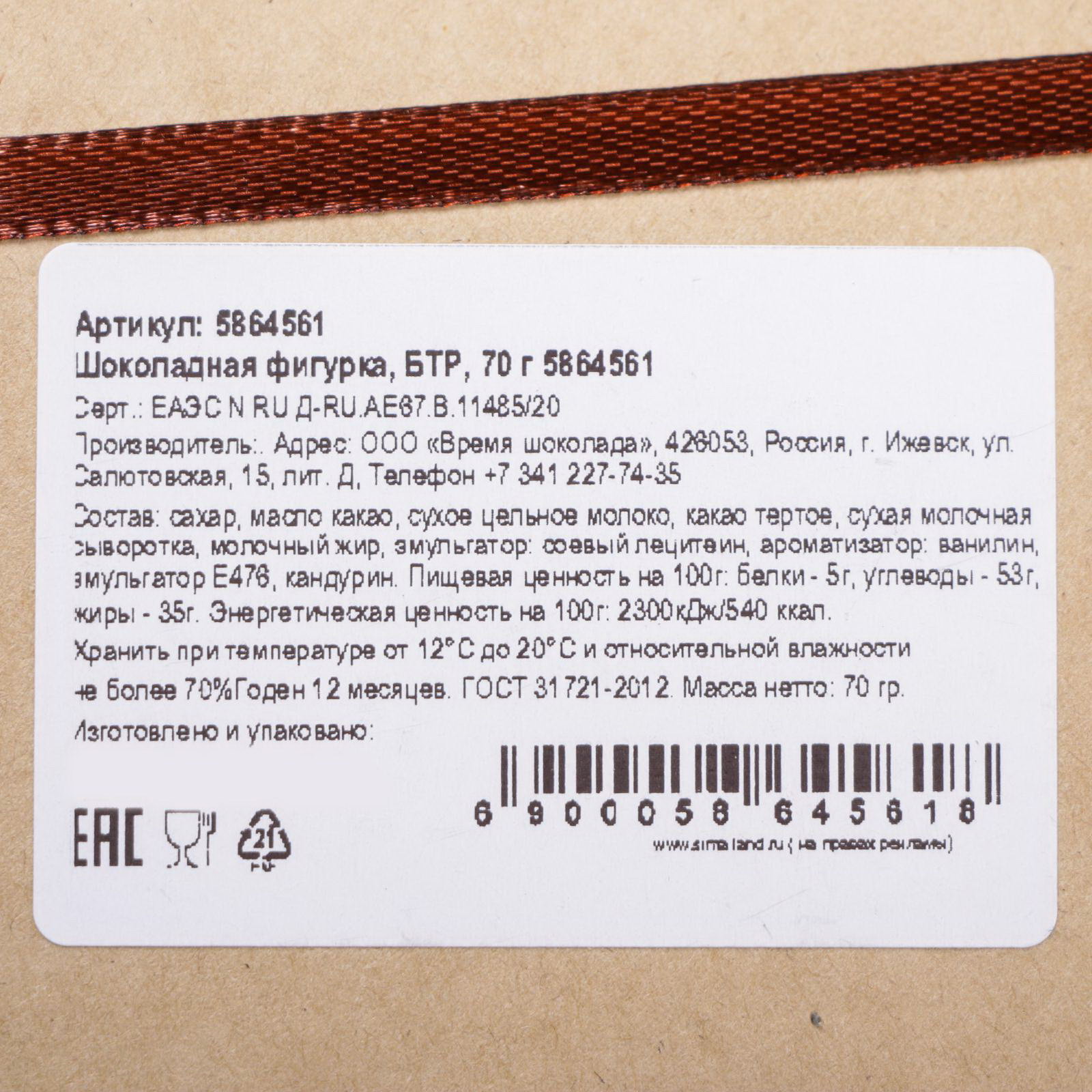 Размер упаковки: 15 x 5 x 11.5 см. tnved: 1806201000 Продукты: Да Тематика праздника: 23 Февраля Температурное ограничение: Нет Добавки: Без добавок Вес нетто, г: 70 Вид шоколада: Молочный Форма: Фигурка Жиры, г: 35 Углеводы, г: 53 Белки, г: 5 Энергетическая ценность, ккал: 540 Шоколадные фигурки станут отличным подарком или дополнением к основному презенту. Сюрприз получится красивым и действительно вкусным. Вручить такой подарок можно на праздники или просто так, а вкус и аромат шоколада принесет множество положительных эмоций и надолго запомнится своей оригинальностью! | ||